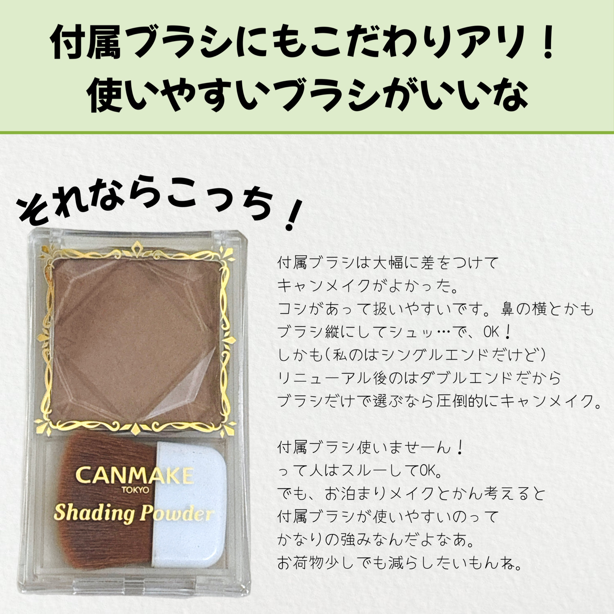 キャンメイクシェーディングパウダー05ムーングレージュというカラーです。これは日本人の肌に合う色だと思います!748円(安すぎ)ドラストで購入できます。 粉質はサラサラで、筆付きなのでめちゃくちゃ楽ちんです。ありがとう。底見えまでに3年かかってるのでコスパもいいです。 色味は本当に肌に馴染みます。自然。ナチュラル。ナチュラルボーン。
