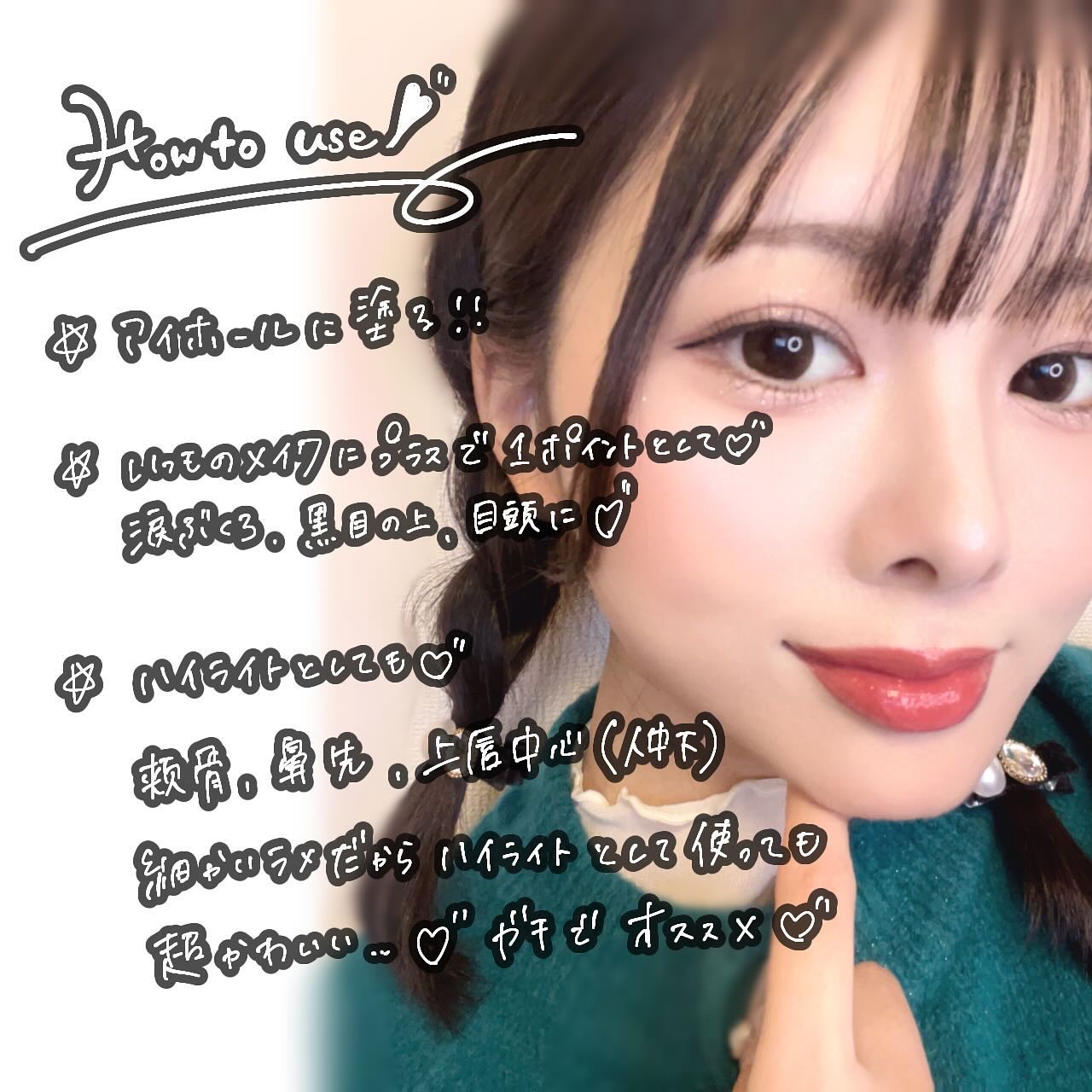 パッと見は、ザクッとしてるのかと思いきや、指で触れるとちょっぴりしっとりとしたパウダーのキラキララメ✨ 一度密着するとラメ飛びも少なめ◎ 涙袋にのせたりハイライトとして頬に軽くのせるのも可愛くて使い勝手の良い商品☝️