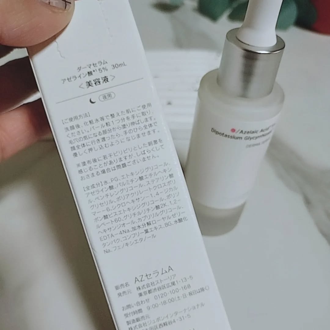 - <ダーマセラム アゼライン酸5%> 水、PG、エトキシジグリコール、アゼライン酸、パルミチン酸エチルヘキシル、ペンチレングリコール、ステアリン酸グリセリル、ポリアクリレートクロスポリマー-6、シクロヘキサン-1,4-ジカルボン酸ビスエトキシジグリコール、ポリソルベート60、グリチルリチン酸2K、1,2-ヘキサンジオール、カプリリルグリコール、EDTA-4Na、加水分解ローヤルゼリータンパク、コンフリー葉エキス、BG、水酸化Na、フェノキシエタノール