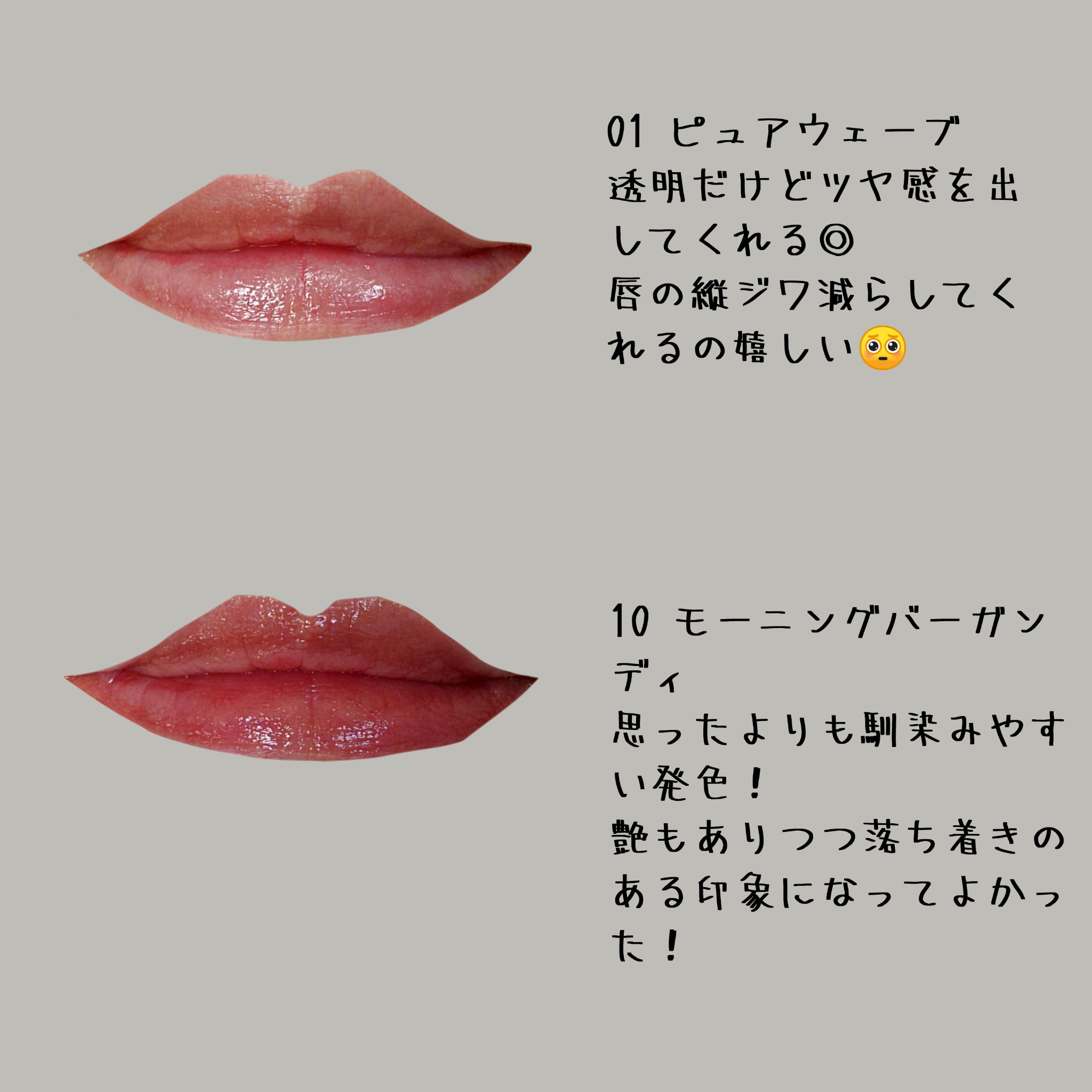 - <11 ピュアウェーブ > リンゴ酸ジイソステアリル、ビスジグリセリルポリアシルアジペート-2、ポリイソブテン、オクチルドデカノール、ダイマージリノール酸(フィトステリル/イソステアリル/セチル/ステアリル/ベヘニル)、セレシン、マイクロクリスタリンワックス、合成ワックス、ヘキサ(ヒドロキシステアリン酸/ステアリン酸/ロジン酸)ジペンタエリスリチル、(VP/ヘキサデセン)コポリマー、キャンデリラロウ、1,2-ヘキサンジオール、セスキオレイン酸ソルビタン、メントール、乳酸メンチル、バニリルブチル、水、エチルヘキシルグリセリン、シア脂、ツバキ種子油、カニナバラ種子エキス、酢酸トコフェロール、水添ポリイソブテン、BG、ヒアルロン酸Na、BHT、ソケイ花エキス、マドンナリリー花エキス、バラエキス、チャ葉エキス、フリージアエキス、ハナショウブエキス、エーデルワイスエキス、ハス花エキス、ハナスゲ根エキス、トコフェロール、黄4、赤104(1) <12 モーヴビーチ> リンゴ酸ジイソステアリル、ビスジグリセリルポリアシルアジペート-2、ダイマージリノール酸(フィトステリル/イソステアリル/セチル/ステアリル/ベヘニル)、ヘキサ(ヒドロキシステアリン酸/ステアリン酸/ロジン酸)ジペンタエリスリチル、オクチルドデカノール、マイクロクリスタリンワックス、セレシン、ポリイソブテン、合成ワックス、(VP/ヘキサデセン)コポリマー、キャンデリラロウ、1,2-ヘキサンジオール、セスキオレイン酸ソルビタン、メントール、乳酸メンチル、バニリルブチル、水、エチルヘキシルグリセリン、シア脂、ツバキ種子油、カニナバラ種子エキス、酢酸トコフェロール、水添ポリイソブテン、BG、ヒアルロン酸Na、BHT、ソケイ花エキス、マドンナリリー花エキス、バラエキス、チャ葉エキス、フリージアエキス、ハナショウブエキス、エーデルワイスエキス、ハス花エキス、ハナスゲ根エキス、トコフェロール、酸化チタン、赤202、酸化鉄、赤104(1) <13 ピーチクラッシュ> リンゴ酸ジイソステアリル、ビスジグリセリルポリアシルアジペート-2、オクチルドデカノール、ダイマージリノール酸(フィトステリル/イソステアリル/セチル/ステアリル/ベヘニル)、ポリイソブテン、セレシン、マイクロクリスタリンワックス、ヘキサ(ヒドロキシステアリン酸/ステアリン酸/ロジン酸)ジペンタエリスリチル、合成ワックス、(VP/ヘキサデセン)コポリマー、キャンデリラロウ、1,2-ヘキサンジオール、セスキオレイン酸ソルビタン、メントール、乳酸メンチル、バニリルブチル、水、エチルヘキシルグリセリン、シア脂、ツバキ種子油、カニナバラ種子エキス、酢酸トコフェロール、水添ポリイソブテン、BG、ヒアルロン酸Na、BHT、チャ葉エキス、フリージアエキス、ハナショウブエキス、ソケイ花エキス、エーデルワイスエキス、マドンナリリー花エキス、ハス花エキス、バラエキス、ハナスゲ根エキス、トコフェロール、赤104(1)、黄4、酸化チタン、黄5、赤202 <14 ベリーフィズ > リンゴ酸ジイソステアリル、ビスジグリセリルポリアシルアジペート-2、オクチルドデカノール、ダイマージリノール酸(フィトステリル/イソステアリル/セチル/ステアリル/ベヘニル)、ポリイソブテン、セレシン、マイクロクリスタリンワックス、ヘキサ(ヒドロキシステアリン酸/ステアリン酸/ロジン酸)ジペンタエリスリチル、合成ワックス、(VP/ヘキサデセン)コポリマー、キャンデリラロウ、1,2-ヘキサンジオール、セスキオレイン酸ソルビタン、メントール、乳酸メンチル、バニリルブチル、水、エチルヘキシルグリセリン、シア脂、ツバキ種子油、カニナバラ種子エキス、酢酸トコフェロール、水添ポリイソブテン、BG、ヒアルロン酸Na、BHT、チャ葉エキス、フリージアエキス、ハナショウブエキス、ソケイ花エキス、エーデルワイスエキス、マドンナリリー花エキス、ハス花エキス、バラエキス、ハナスゲ根エキス、トコフェロール、赤104(1)、酸化チタン、黄5、赤201、赤202 <15 モーニングバーガンディ> リンゴ酸ジイソステアリル、ビスジグリセリルポリアシルアジペート-2、ダイマージリノール酸(フィトステリル/イソステアリル/セチル/ステアリル/ベヘニル)、ヘキサ(ヒドロキシステアリン酸/ステアリン酸/ロジン酸)ジペンタエリスリチル、オクチルドデカノール、マイクロクリスタリンワックス、ポリイソブテン、セレシン、合成ワックス、(VP/ヘキサデセン)コポリマー、キャンデリラロウ、1,2-ヘキサンジオール、セスキオレイン酸ソルビタン、メントール、バニリルブチル、乳酸メンチル、水、エチルヘキシルグリセリン、酢酸トコフェロール、カニナバラ種子エキス、ツバキ種子油、シア脂、水添ポリイソブテン、BG、ヒアルロン酸Na、BHT、バラエキス、ハス花エキス、マドンナリリー花エキス、エーデルワイスエキス、ソケイ花エキス、ハナショウブエキス、フリージアエキス、チャ葉エキス、ハナスゲ根エキス、トコフェロール、赤202、黄5、酸化