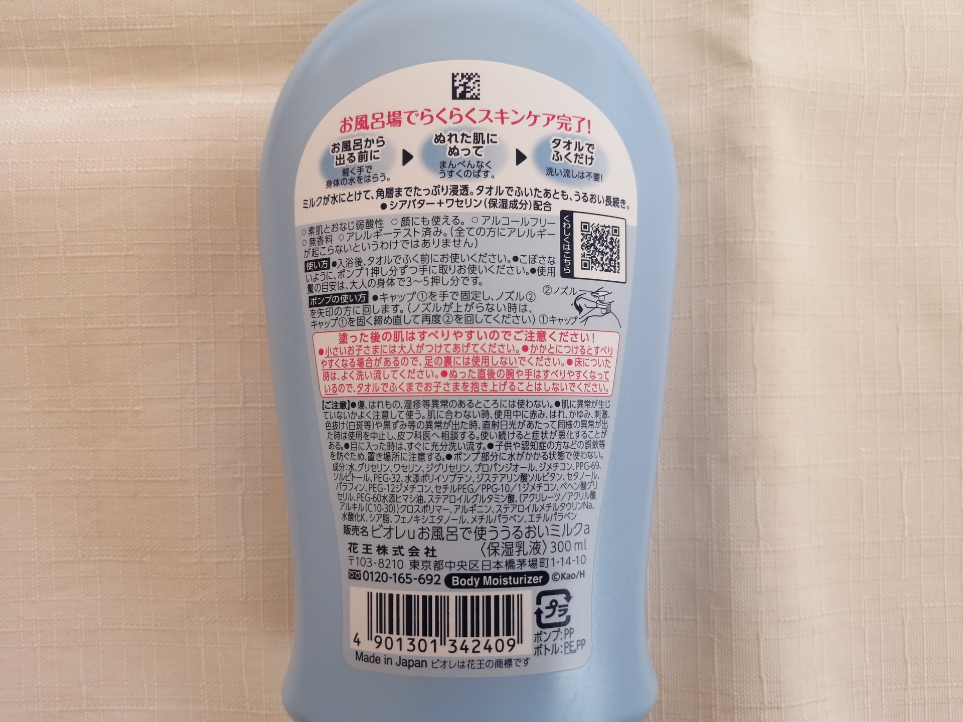 - ぬれた肌にぬるだけ!お風呂場でらくらくスキンケア完了!シアバター、ワセリン配合(保湿成分)のミルクが、水にとけて角層までたっぷり浸透。タオルでふいた後もうるおい長続き。 ●素肌とおなじ弱酸性 ●顔にも使える。 ●アルコールフリー ●無香料 ●アレルギーテスト済み。(全ての方にアレルギーがおこらないというわけではありません)