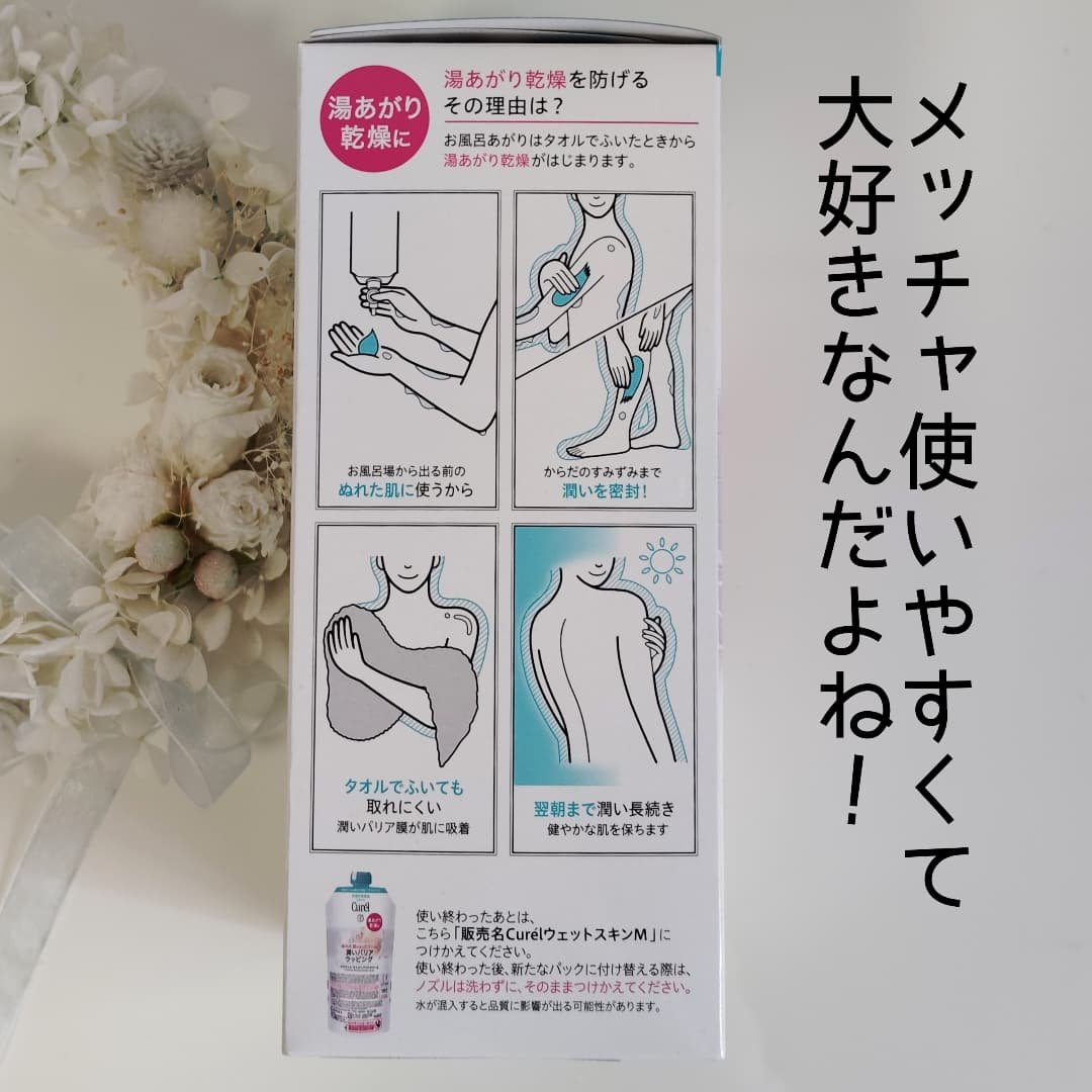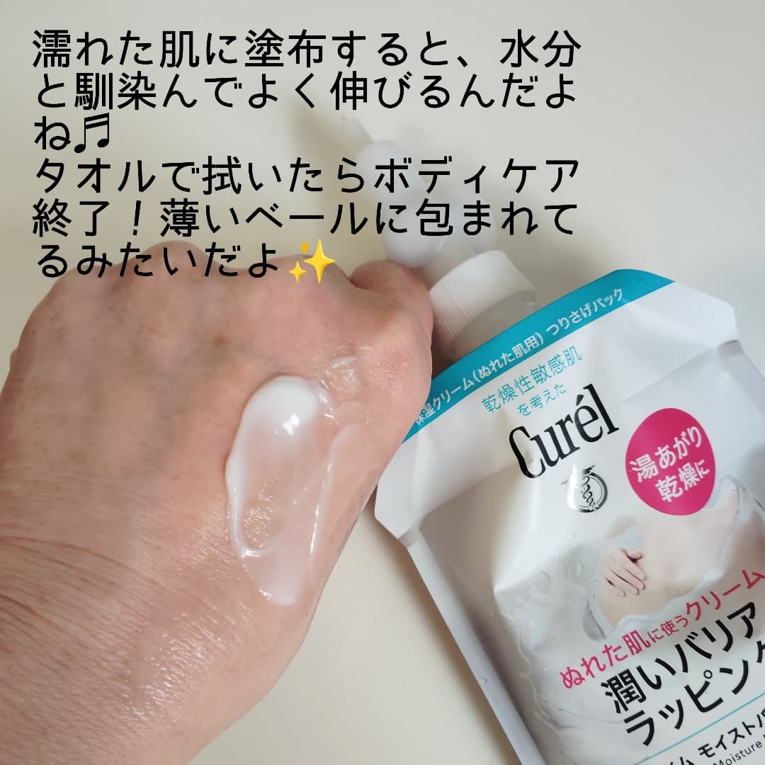 - 【敏感肌用】 湯あがり乾燥する前に、ぬれた肌に使うクリーム。潤いバリアラッピング。セラミド機能成分*(潤い成分)を含んだ潤いバリア膜が、肌がぬれたまま潤いを密封。タオルでふいても、保湿成分がしっかりと肌に残るので、全身膜で守られているような潤い肌に。 ●消炎剤配合(有効成分)配合。肌荒れを防ぐ。 ●長時間潤ったまま、健やかな肌に保ちます。(医薬部外品) *ヘキサデシロキシPGヒドロキシエチルヘキサデカナミド 商品に関するお問い合わせ 受付時間9:00~17:00(土曜・日曜・祝日除く) *製品の誤飲・誤食など緊急の場合は、受付時間外でもお電話ください キュレル:0120-165-698