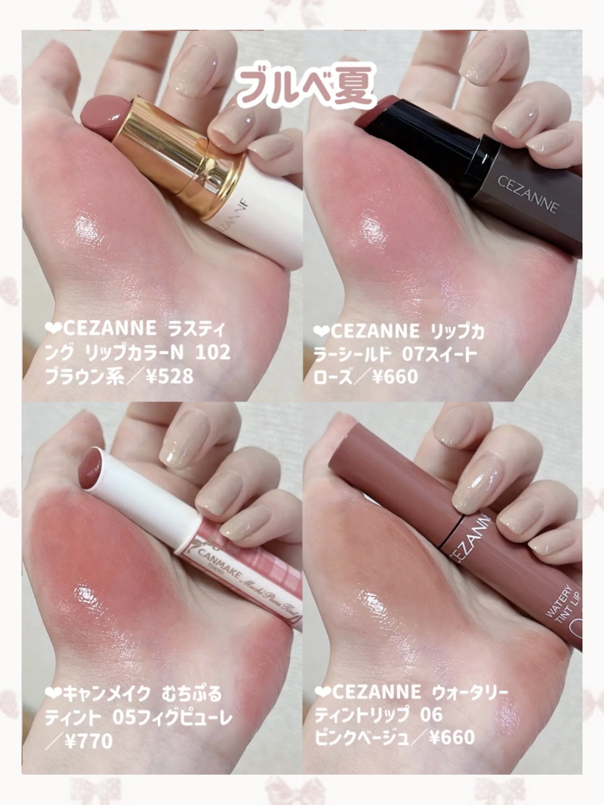 温もりのあるオレンジベージュ (01)バタースコッチ 血色の感じるヌーディーピンク (02)モモ 気品まとうローズレッド (03)ワインベリー 甘い雰囲気を出せるモーヴピンク (06)ラズベリーケーキ 上品なピンクベージュ (T02)ロゼミルクティー ピュアな発色の真紅レッド (T03)ディアレストレッド 明るくオシャレなオレンジ [02]スマイリーガーベラ 深みのあるブラウン [16]アールグレイリーフ