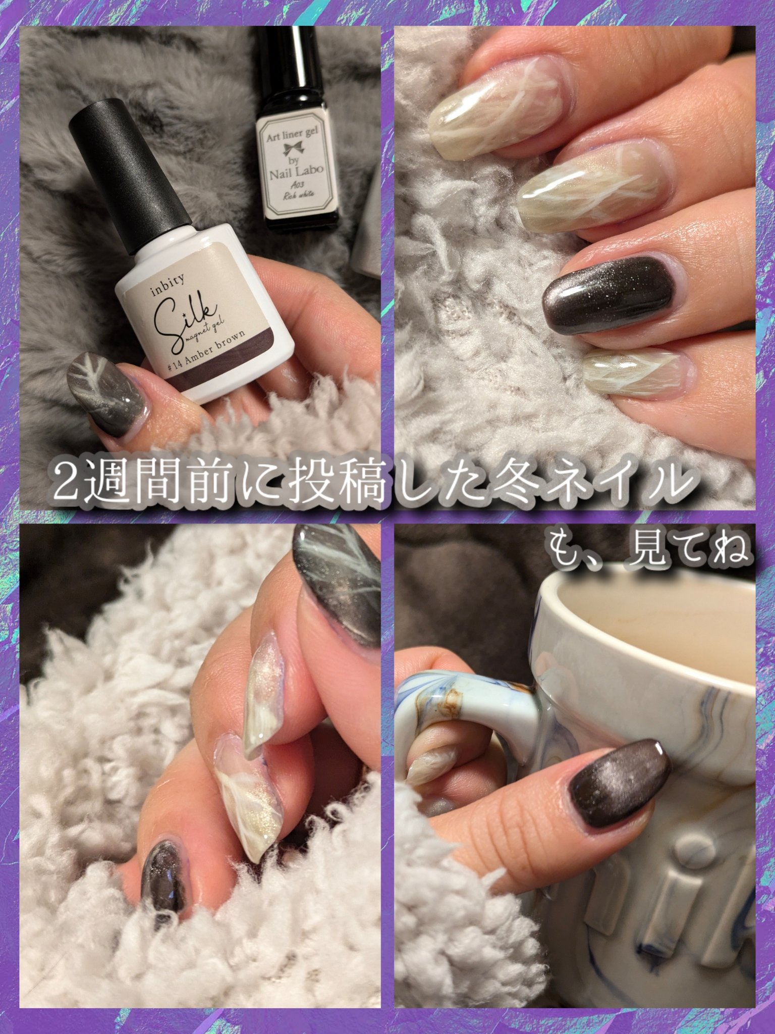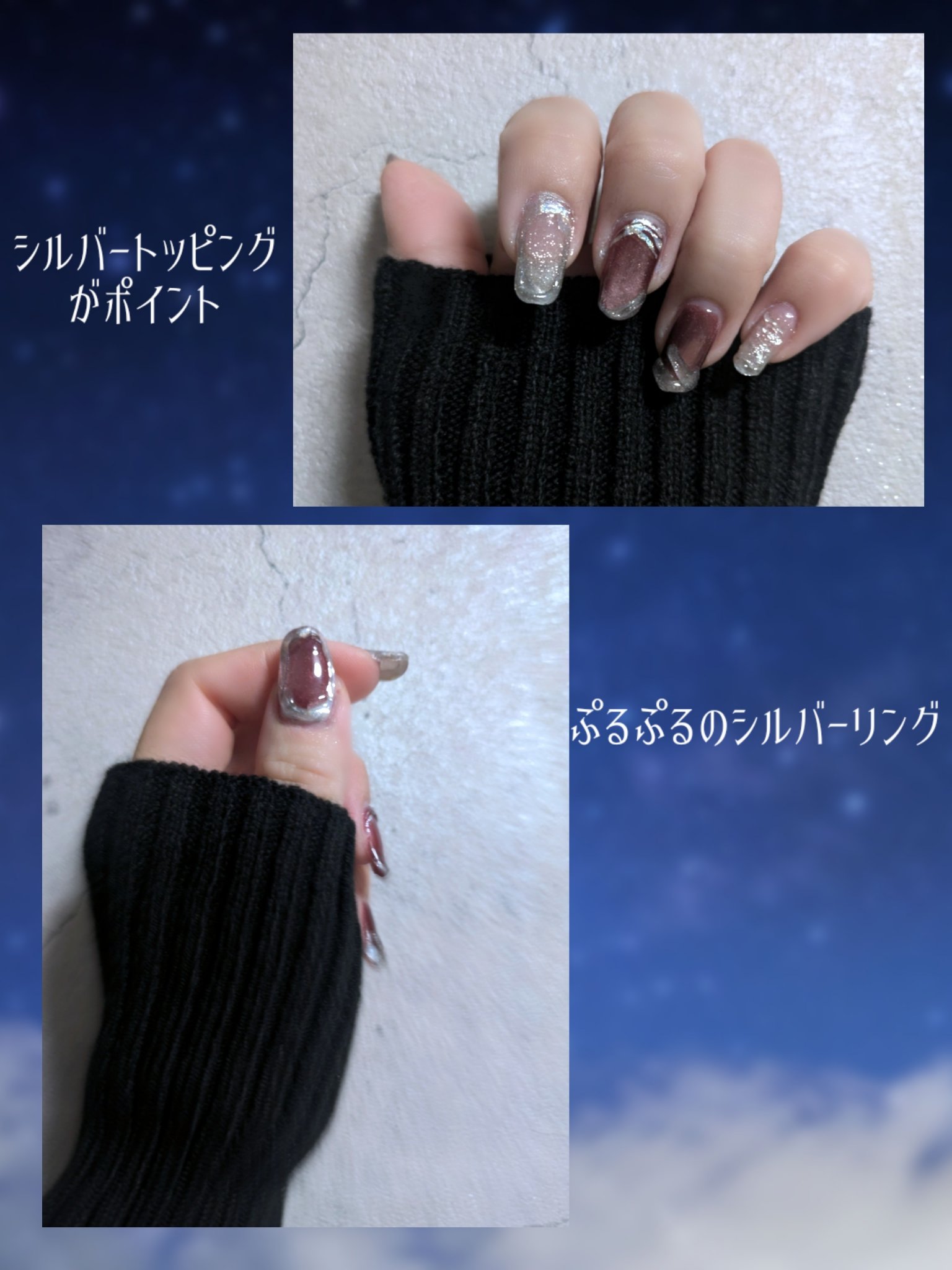 透け感があるので真っ黒という感じではなくて、どちらかというとグレーっぽい色味でした🖤 黒だけど重くなりすぎず軽やかな仕上がりです✨ ラメはシルバー系でした。繊細なラメがふんわりと上品に輝いてるという感じ。どちらかというとキラキラ感は控えめでした✨ クリスマスから年末年始にかけて活躍してくれそうな華やかなカラーでした!