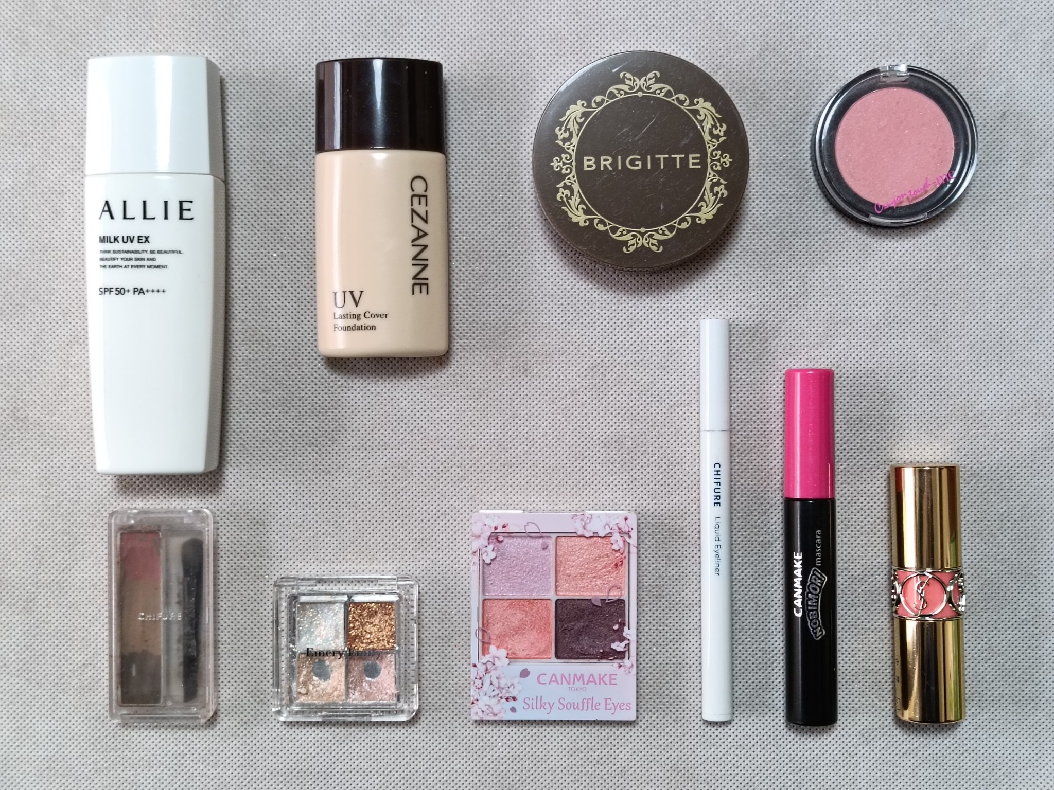 アリィー ニュアンスチェンジUV ジェル RSを、顔全体にまんべんなく塗ります。 RMK RMK ジェルクリーミィファンデーション 103を、顔全体にまんべんなく塗ります。 ジョンソンベビー ジョンソン ベビーパウダーを、顔全体にまんべんなく軽くはたきます。 THE BODY SHOP bronze shade warm glowを、両頬に塗ります。 KATE リフレクトミラーアイズ BR-1の締め色を、眉毛全体にまんべんなく塗ります。 URGLAM UR GLAMBLOOMING EYE COLOR PALETTE 01を、使用しました。 ちふれ リキッド アイライナー 筆ペンタイプ BK30 ブラックを、塗ります。 CEZANNE エアリーカールマスカラを、まつ毛全体にまんべんなく塗ります。 MAYBELLINE NEW YORK コロッサルボリュームエクスプレスを、まつ毛全体にまんべんなく塗ります。 MAYBELLINE NEW YORK SPステイ マットインク 135を、唇全体にまんべんなく塗ります。