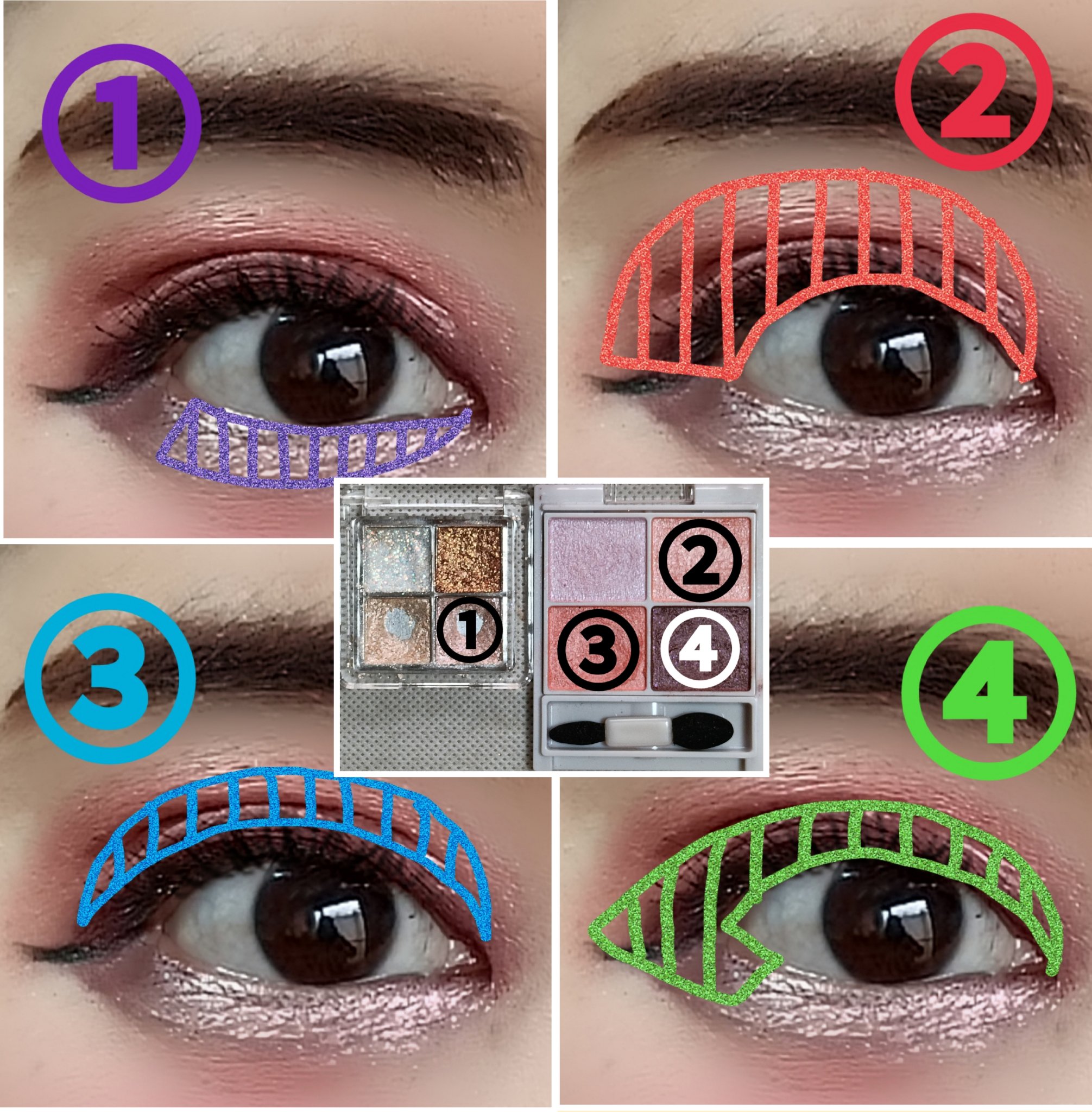 アイシャドウパレットは、URGLAM UR GLAMBLOOMING EYE COLOR PALETTE 02を、使用しました。 マスカラは、MAYBELLINE NEW YORK コロッサルボリュームエクスプレスを、まつ毛全体にまんべんなく塗ります。 リップは、wet 'n' wild MegaLast Lip Colorを、唇全体にまんべんなく塗ります。