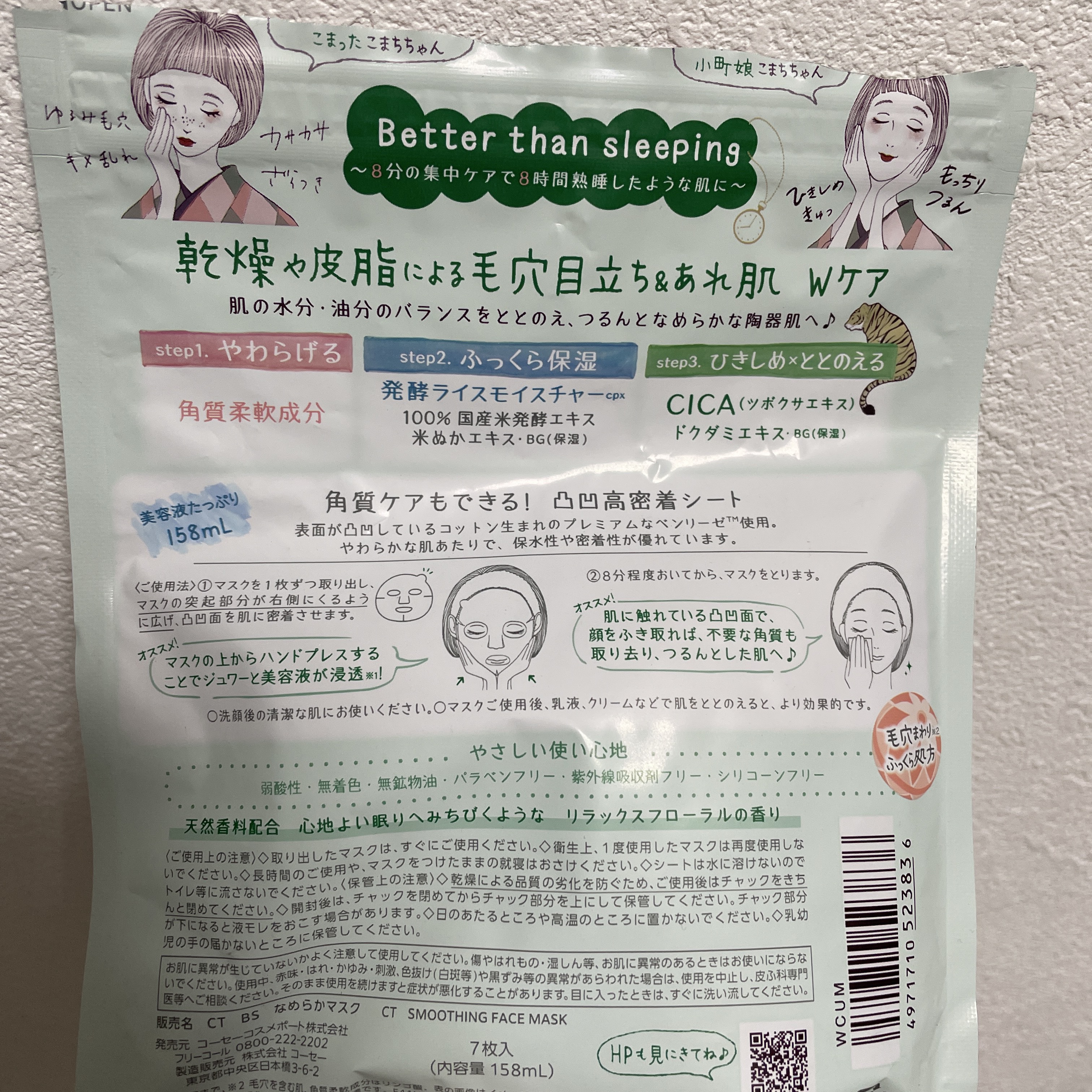 - 毛穴・肌あれが同時にケアできる、毛穴小町マスク! ①毛穴目立ち&肌あれをダブルでケア!なめらか陶器肌へ 水分・油分をバランスよく配合したみずみずしい美容液で、乾燥や皮脂による毛穴目立ちやあれ肌もケアします。キメのととのった、つるんとなめらかな陶器肌に導きます。 角質柔軟成分※3配合。肌をやわらげます。 100%国産米発酵エキス・米ぬかエキス・BG(保湿)をはじめとする発酵ライスモイスチャーCPX配合。ふっくらと保湿します。 ツボクサエキス・ドクダミエキス・BG(保湿)配合。ツボクサエキスは今話題のCICA成分です。肌をひきしめととのえます。 ※3 角質柔軟成分はリンゴ酸 ②角質ケアできる凸凹高密着シート コットン生まれでやわらかな肌触りの国産シートを採用。シートマスクの表面には凸凹のエンボス加工を施しているため、密着性が高く、はがしたマスクでやさしく顔をふきとることで角質ケアもできます。 ③心地よい眠りにみちびくようなリラックスフローラルの香り(天然香料配合) ④やさしい使い心地 弱酸性・無着色・無鉱物油・パラベンフリー・紫外線吸収剤フリー・シリコーンフリーのやさしい使い心地です。