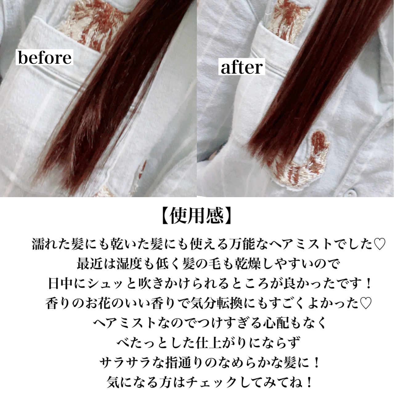 | ヘアケア・スタイリングランキング第53位 | ヘアミストなのできつすぎず、ふわ~っと優しいフローラルな匂いが漂います🍃 | 詳細を見る | |