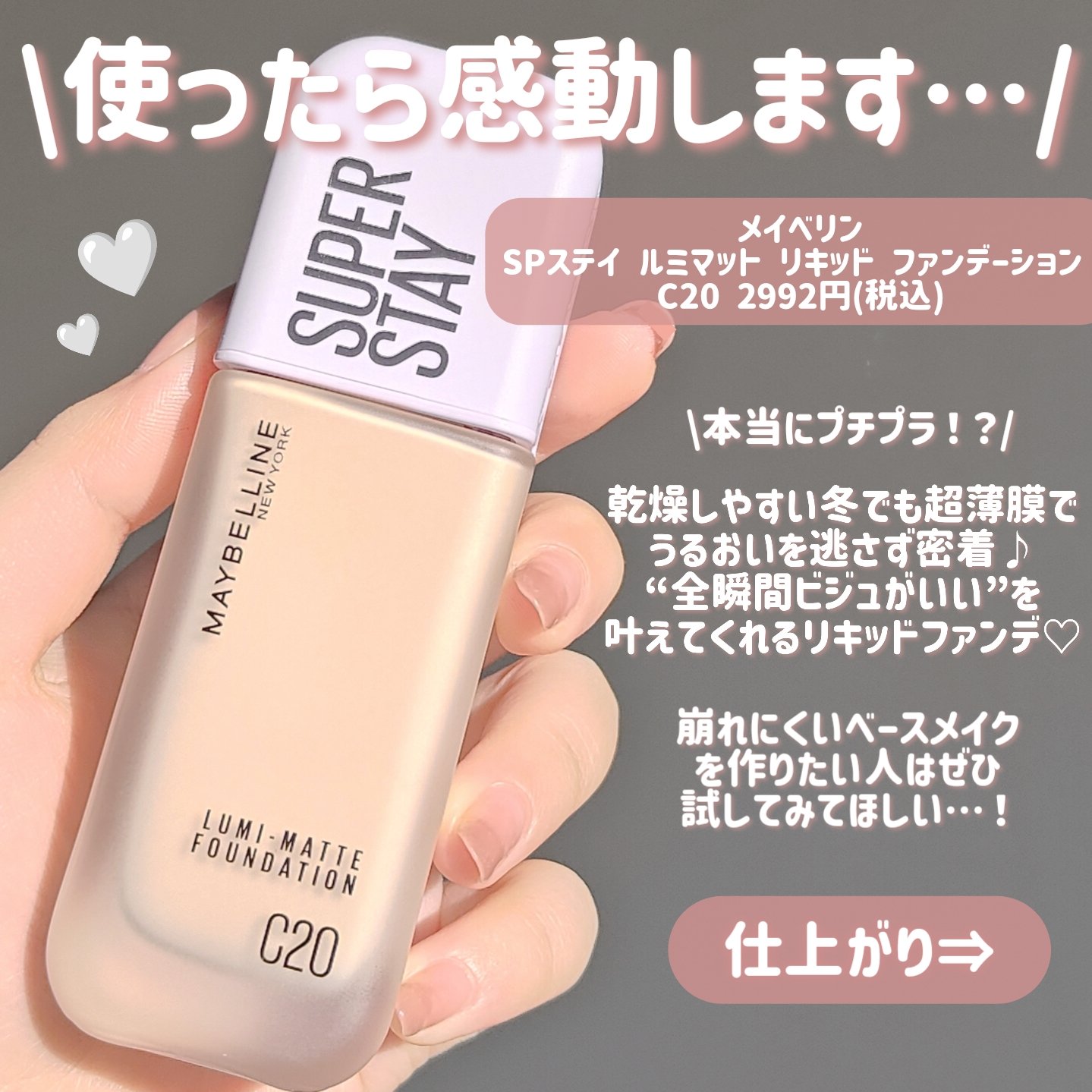 超うす膜で肌にぴたっと密着し、ナイアシンアミドなどの6種の保湿成分*配合で冬でも乾燥しにくいリキッドファンデ🤍 塗り心地が軽く崩れにくいのがさすがメイベリン✨ 少量を素早く馴染ませて、気になるところは重ね塗りすると綺麗に仕上がるよ◎