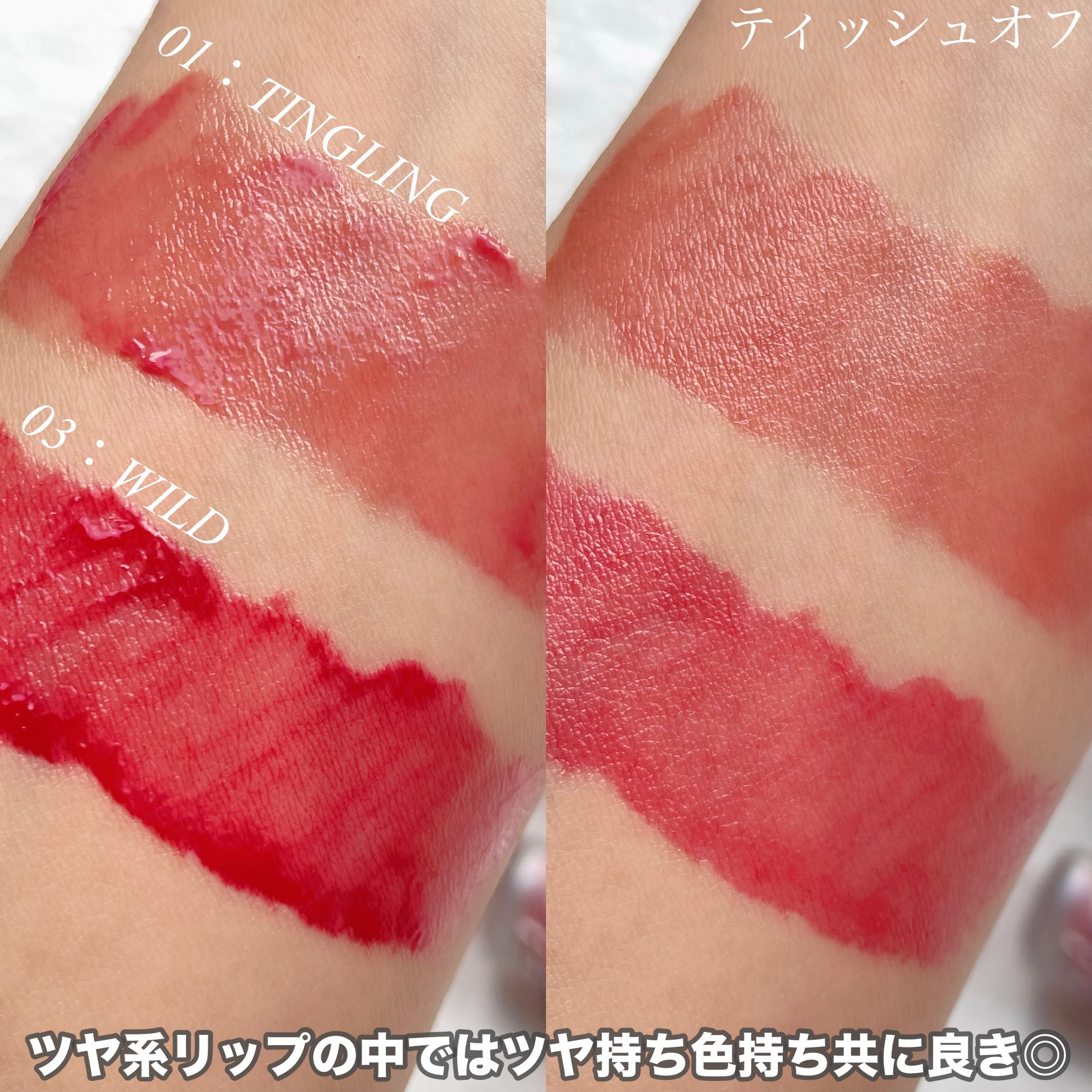 世界初の成分アプローチ🪄で 唇をこすり合わせずにじっと待つと(5分ほど) 透明ジェル膜がコートしてくれてキレイ色と ツヤが続く新処方のリップティントです💄 ツヤ好きにはたまらない... ちゅるちゅる感がとっても可愛い🥺💓 ツヤ持ちも良くマスク移りもありませんでした👍🏻 ̖́- ただ、私の場合ですが上唇のお山の部分と 中心部分が濃く残ってしまうという落ち方で ムラっぽく見えるのでお直しは必須かな😵💫💡
