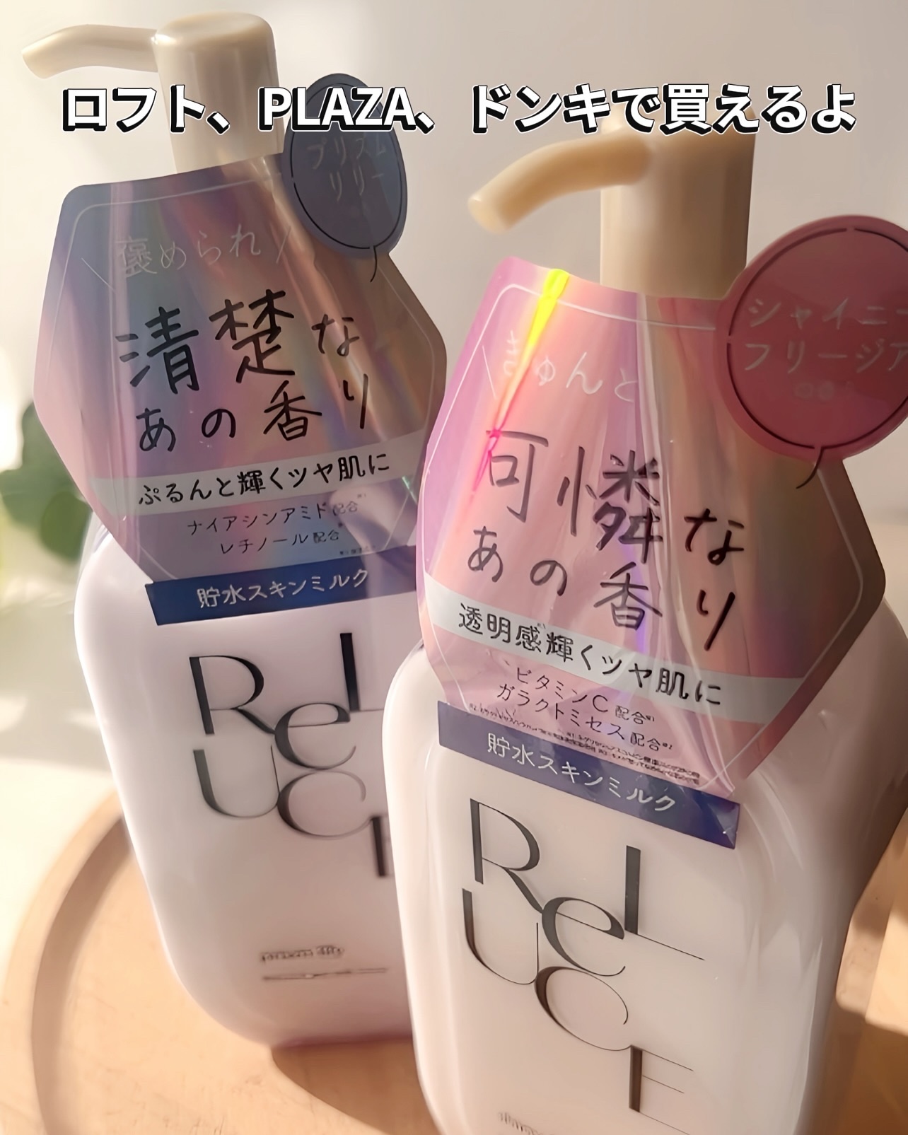 まるで高級香水のような香りが広がる「リルーチェ ミルクローション」、一度使ったらクセになる香り💖 🎀シャイニーフリージア 洋梨とフリージアのフレッシュでみずみずしい香り。 ビタミンC、レチノール、ナイアシンアミド、スキンケアプロテインが贅沢に配合✨