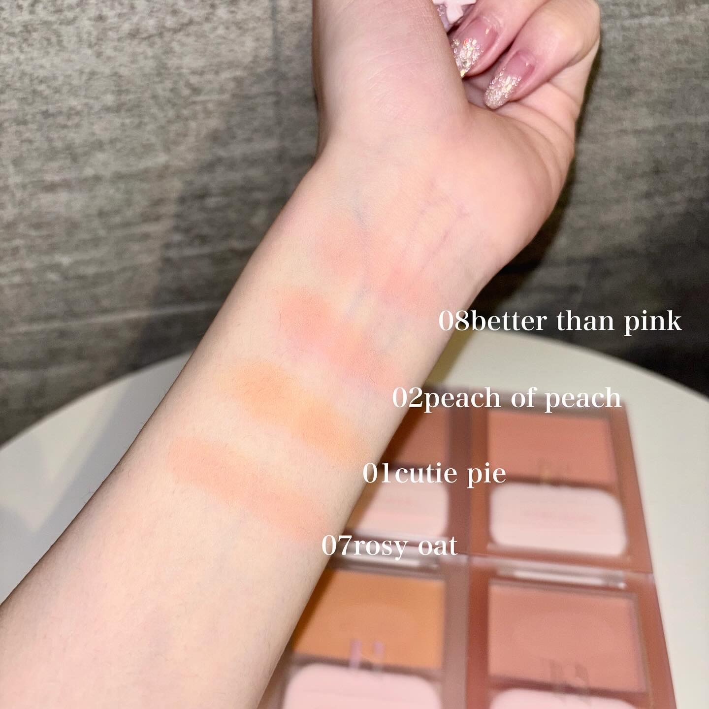 アイシャドウは可愛い配色なのはもちろんのこと、予想していたより発色が良くて驚きました!❤︎ 私は白みピンクが大好物であり得意なのでまぶたでも綺麗に発色してくれてドンピシャなカラー🥹🥹 ラメもそれぞれ個性があって素敵...😭🩷🩷 チークもまた予想以上に発色が良くて、驚きました😳 4色でグラデーションがしやすいし、ちゃんと見た目通りの発色なのでギャップを感じにくくて感動です... 可愛さだけじゃないところがさすがdasique🎀 おまけに付いていたグロスなどもめちゃくちゃ可愛くて、全部見ているだけで幸せになれそうです🥺