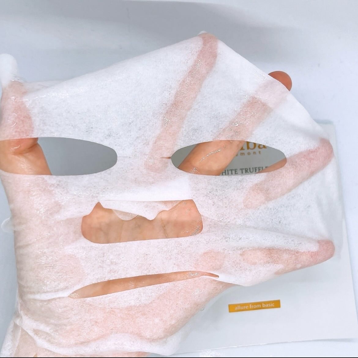 スキンフィットシートで、しっかりデイリーケア。 シートは薄めで滑らか柔らかめ!とろみのある美容液がたっぷり入ってる! イタリア産ホワイトトリュフが配合されてて、肌に水分を供給し、肌を整えてくれるって。しっとりもっちりとした使い心地がスキー! あごの下からシートマスクを引っ張って貼り付けてVラインを集中ケア。 シートが分厚くて液がしみこんでる感じ。