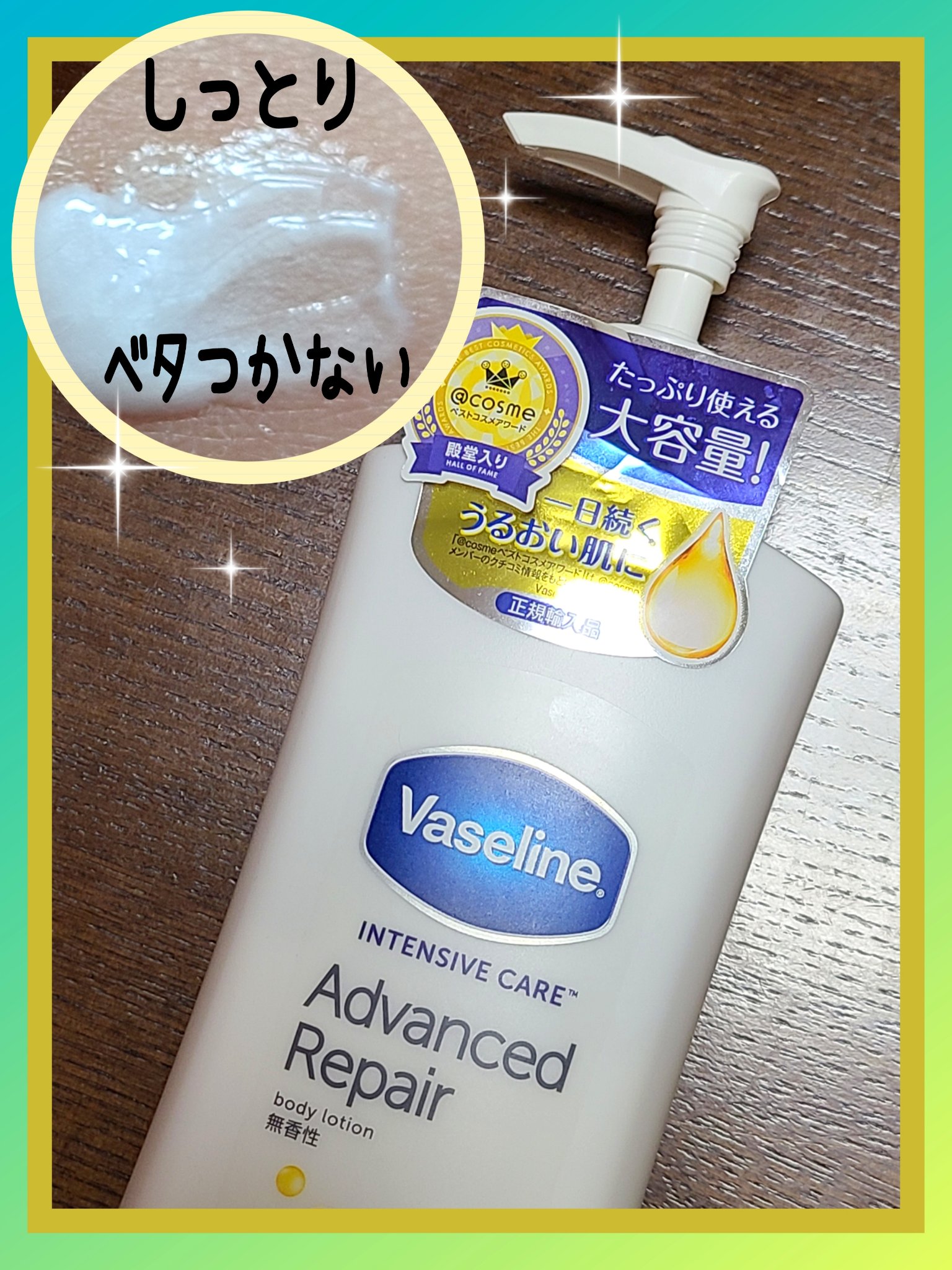 今回は、ヴァセリンアドバンスドリペアボディローション使いきった感想です✨クリームぽいテクスチャー出した時はこっくり固めですがするする伸びて程よいしっとり感が長続き睡眠前にぬって翌朝はしっとり無香料なのも他の香りと混ざらなくて良かった🦋カサつき...