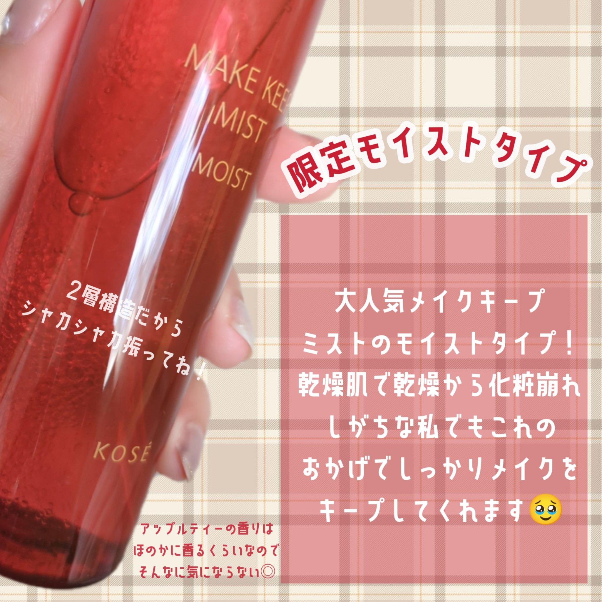 - 限定発売 ●しっとりツヤ肌を叶えるモイストタイプで、 冬にぴったりの、スパイスの隠し味が効いた、心いやされるアップルティーの香りが限定で登場。 うるおい・ツヤ成分が日中の乾燥から肌をまもり、ツヤ高く仕上がります。 ●コーセーオリジナルの「スーパーメイクコート成分」配合で、 メイクよれを防止。 表情の動きにもよれない優れた柔軟性をもつスーパーメイクコート成分は、 表情の変化によるメイクよれを防止。 美しい仕上がりをキープします。 ●日中の乾燥から肌を守る 「うるおい膜処方」採用。 シカ成分をはじめとする数種の保湿成分や、しっとりしたオイルを閉じ込め、日中の乾燥を防ぎます。 ●肌を長時間しっとりコーティングするオイルの配合量アップ。 ツヤ感を演出し、膜の均一性もアップ。 オイルは汗になじみにくいため、汗くずれ防止効果もアップしました。 ●乾燥環境下での試験済み※。 目もとのシワへの化粧落ちを防ぎ、 美しい仕上がりをキープ。 ※化粧もちに関して (コーセー調べ。 効果には個人差があります。) ●ウォータープルーフで、 汗・水 涙にも負けない撥水効果を発揮。 撥水性の高い膜が、隙間なく均一に肌へ密着。 汗・水・涙をはじき、メイクくずれを防ぎます。 皮脂テカリ・くずれ防止成分配合で、テカリ&毛穴落ちを防止。 高い皮脂プルーフ効果で皮脂をはじくと同時にテカリを防止。 メイクの毛穴落ちまで防ぎます。 ●ふんわり細やかなミストが均一な1枚の膜を形成。つけたての美しいメイクを長時間キープ。 メイクをしっかり固定しながら、顔の動きに合わせて伸縮する膜を形成。 時間が経ってもメイクがよれることなく、 美しい仕上がりが長時間持続します。 ●マスク着用によるメイクのよれや、マスクへのメイク移りを防ぎます。 ●大気中の微粒子 (ちり・ほこり・PM2.5など) からお肌をまもります。 ●無着色 <配合成分> スーパーメイクコート成分 、汗・皮脂プルーフ成分 、皮脂テカリ・くずれ防止成分 、うるおい・ツヤ成分 、シカ成分・ヒアルロン酸・コラーゲン・スクワラン(保湿) ※スーパーメイクコート成分は (ジメチコン/ビニルトリメチルシロキシケイ酸) クロスポリマー、汗・皮脂プルーフ成分はトリメチルシロキシケイ酸、皮脂テカリ・ くずれ防止成分は(ジメチコン/ビニルジメチコン)クロスポリマー、 うるおい・ツヤ成分はトリプロピレングリコール、シカ成分はツボクサ葉エキス、ヒアルロン酸は 加水分解ヒアルロン酸、コラーゲンは加水分解コラーゲンです。