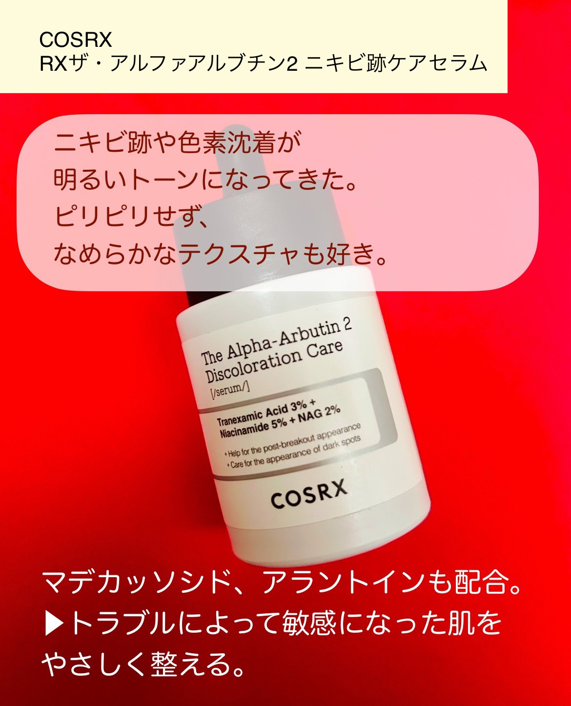 6種類の成分(アルファアルブチン・ナイアシンアミド・トラネキサム酸・アセチルグルコサミン・フェルラ酸・グルタチオン)で色素沈着ケアをしてくれる美容液です。 刺激で敏感になったお肌をケアする成分(5種ヒアルロン酸・パンテノール・トコフェロール・マデカッソシド・アラントイン)も配合で、色素沈着と肌荒れを同時にケア! 薄い赤褐色のサラサラのテクスチャーで肌馴染みがいいです。さっぱりした仕上がりで、メイクの邪魔をせず朝にも使いやすいです😊