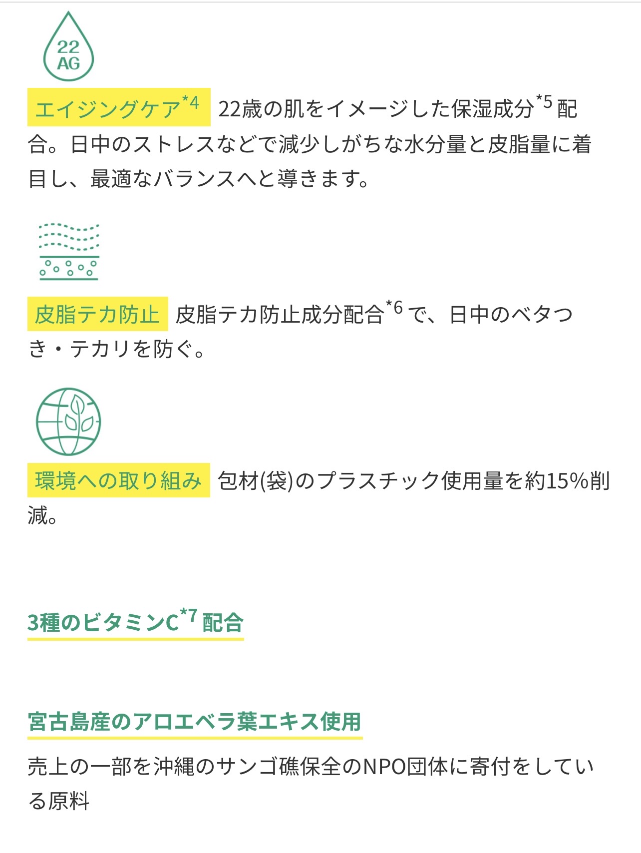 - ※2025年春〜商品パッケージを順次切り替え予定。 2024年4月23日 PLZA・LOFT・公式オンライン先行発売 1分* でひきしめながら潤う!洗顔いらずの朝用オールインマスク!! 洗顔*1+スキンケア+保湿下地 <アイスクリアミントの香り>サラサラひきしめタイプ 【シリース共通】 ●3種のビタミンC 配合 ・アスコルビルグルコシド ・テトラデカン酸アスコルビル ・アスコルビルリン酸Na(以上、全て整肌) ●皮脂テカ防止成分配合 ダイズ種子エキス(保湿) ・日中のベタつき・テカリを防ぐ ●宮古島産アロエベラ葉エキス配合 売上の一部を沖縄のサンゴ礁保全のNPO団体に寄付をしている原料 【化粧ノリUP!サラッと皮脂テカ予防】 水密ヴェール処方:潤いが浸透*2 しながら、肌表面はしっとりキープ。 エイジングケア*3:22歳の肌をイメージした保湿成分。*4 【角質ケア】リンゴ酸+マンデル酸(以上、全て角質ケア)+グリシルグリシン(ひきしめ) 環境への取り組み:包材(袋)のプラスチック使用量を15%削減 * 使用時間目安 *1 ふきとりによる *2 角層まで *3年齢に応じたお手入れ *4(ホホバ油/マカデミア種子油)エステルズ、スクワレン、マカデミアナッツ脂肪酸フィトステリル、フィトステロールズ、水溶性コラーゲン(以上、全て保湿)