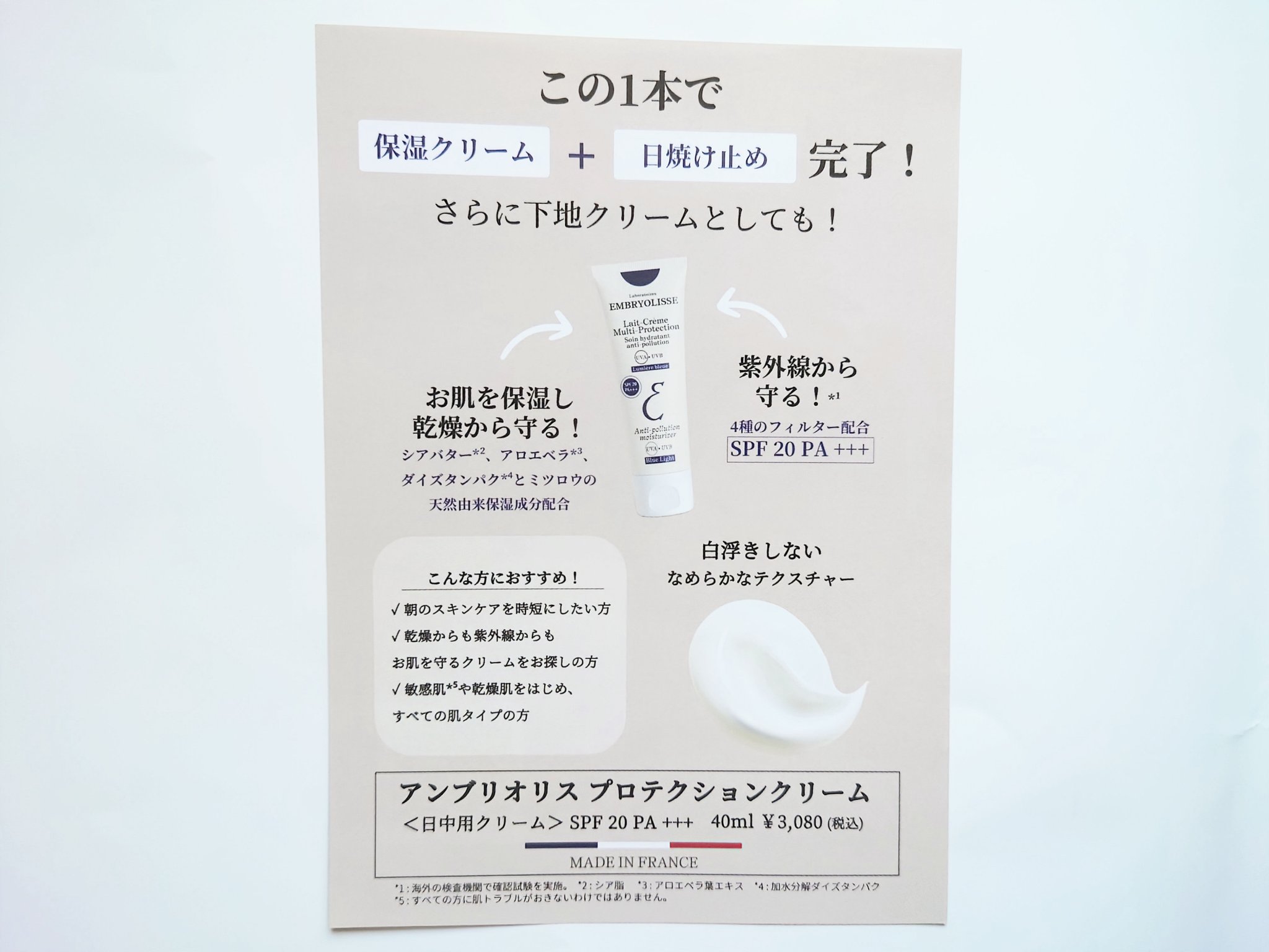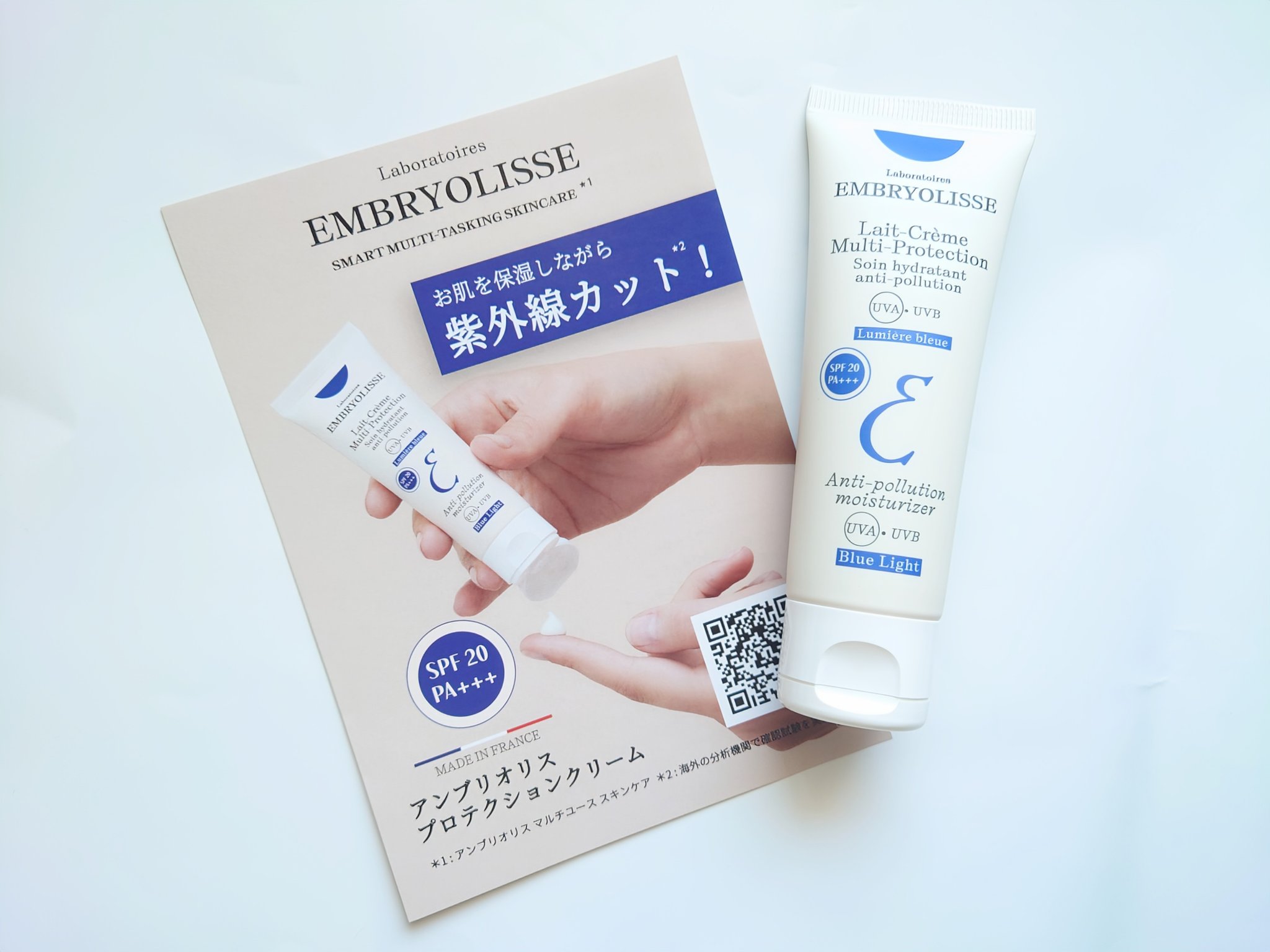 - SPF 20 PA+++ 保湿クリーム・日焼け止めが1 本で完了! ■ 紫外線など日中の様々な刺激からお肌を守る! パソコンやスマホを使用する時間がますます長くなり、1 日6 時間以上画面を見ている人も少なくありません。 しかし、画面から放出されている「ブルーライト」は目だけではなく肌にまでダメージを与えてしまいます。 そんなブルーライトの予防対策が欠かせない今だからこそ、「アンブリオリス プロテクションクリーム」は4 種類のフィルターで、紫外線A・B 波だけではなくブルーライトからも肌を保護してくれます*¹。 *¹:海外の検査機関で確認試験を実施。 ■ 「アンブリオリス」ならではの保湿力と心地良さ 「日焼け止め対策をしっかり行いたいけれど、うるおいとなめらかな使い心地は譲れない!」という方におすすめの「アンブリオリス プロテクションクリーム」。 ロングセラーの「アンブリオリス モイスチャークリーム」と同様に、保湿効果とエモリエント効果に優れたアロエベラ*³、ダイズタンパク*⁴、シアバターとミツロウの天然由来保湿成分を配合しており、肌を保湿して乾燥から守ります。さらに、紫外線やブルーライトからダメージを受ける肌を考えた処方で、ビタミンE(トコフェロール)配合で肌を整えます。年を重ねた肌にうるおいを与えてエイジングケア*⁵。 敏感肌の方にも*⁶お使いいただけます。 白浮きしないなめらかなテクスチャーで、シルクのような透明なヴェールで肌をやさしく包み込みます。 朝のメイク前の下地としてもお使いいただけます。 *3 : アロエベラ葉エキス *4 : 加水分解ダイズタンパク *5 :年齢に応じたお手入れのこと。*6 : すべての方に肌トラブルがおきないわけではありません。 ※成分・処方はそのままに、2023年5月よりパッケージデザインを順次リニューアル