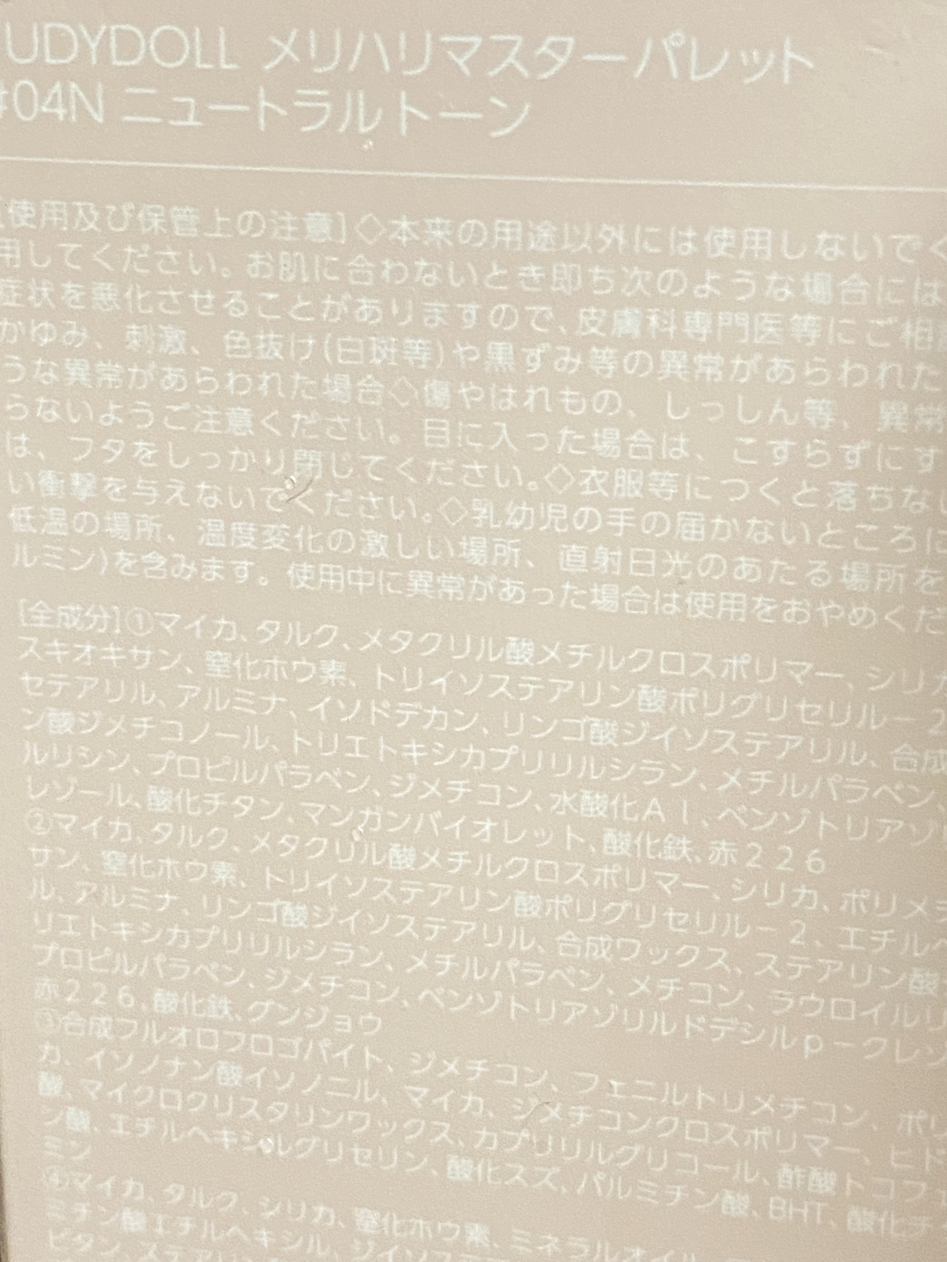 - <01N クールトーン> 01:タルク、合成フルオロフロゴパイト、マイカ、シリカ、窒化ホウ素、ポリエチレン、ジメチコン、トリメチルシロキシケイ酸、エチルヘキサン酸セチル、ステアロイルオキシステアリン酸オクチルドデシル、トリエトキシカプリリルシラン、カプリリルグリコール、エチルヘキシルグリセリン、ハイドロゲンジメチコン、ラウロイルリシン、水酸化Al、酸化チタン、酸化鉄、赤226 02:タルク、マイカ、シリカ、ポリエチレン、窒化ホウ素、ミネラルオイル、ジメチコン、ワセリン、カプリリルグリコール、パルミチン酸エチルヘキシル、トリエトキシカプリリルシラン、セスキイソステアリン酸ソルビタン、エチルヘキシルグリセリン、BHT、トコフェロール、酸化チタン、酸化鉄 03:マイカ、ジメチコン、イソノナン酸イソノニル、タルク、フェニルトリメチコン、ポリブテン、シリカ、ポリメチルシルセスキオキサン、ポリエチレン、マイクロクリスタリンワックス、ジメチコンクロスポリマー、合成フルオロフロゴパイト、カプリリルグリコール、エチルヘキシルグリセリン、酸化スズ、トリエトキシカプリリルシラン、BHT、酸化チタン、酸化鉄 04:タルク、マイカ、シリカ、ポリエチレン、オクチルドデカノール、ジメチコン、ポリメチルシルセスキオキサン、トリ(カプリル酸/カプリン酸)グリセリル、トリエトキシカプリリルシラン、窒化ホウ素、カプリリルグリコール、ワセリン、エチルヘキシルグリセリン、セスキイソステアリン酸ソルビタン、BHT、トコフェロール、酸化鉄、酸化チタン <02N ウォームトーン> 01:タルク、合成フルオロフロゴパイト、マイカ、シリカ、窒化ホウ素、ポリエチレン、ジメチコン、トリメチルシロキシケイ酸、エチルヘキサン酸セチル、ステアロイルオキシステアリン酸オクチルドデシル、トリエトキシカプリリルシラン、カプリリルグリコール、エチルヘキシルグリセリン、ハイドロゲンジメチコン、ラウロイルリシン、水酸化Al、酸化チタン、酸化鉄、赤226 02:タルク、マイカ、シリカ、ポリエチレン、ミネラルオイル、窒化ホウ素、ワセリン、ジメチコン、パルミチン酸エチルヘキシル、カプリリルグリコール、トリエトキシカプリリルシラン、セスキイソステアリン酸ソルビタン、エチルヘキシルグリセリン、BHT、トコフェロール、酸化チタン、酸化鉄 03:合成フルオロフロゴパイト、ジメチコン、タルク、イソノナン酸イソノニル、フェニルトリメチコン、ホウケイ酸(Ca/Na)、ポリブテン、シリカ、ホウケイ酸(Ca/Al)、ポリメチルシルセスキオキサン、マイクロクリスタリンワックス、ジメチコンクロスポリマー、カプリリルグリコール、酸化スズ、エチルヘキシルグリセリン、トリエトキシカプリリルシラン、BHT、酸化チタン、酸化鉄 04:タルク、マイカ、シリカ、オクチルドデカノール、ジメチコン、ポリエチレン、トリ(カプリル酸/カプリン酸)グリセリル、窒化ホウ素、トリエトキシカプリリルシラン、カプリリルグリコール、ワセリン、エチルヘキシルグリセリン、セスキイソステアリン酸ソルビタン、BHT、トコフェロール、酸化鉄 <04N ニュートラルトーン> 01:タルク、マイカ、シリカ、 (ビニルジメチコン/メチコンシルセスキオキサン)クロスポリマー、ポリメチルシルセスキオキサン、トリイソステアリン酸ポリグリセリル-2、窒化ホウ素、 エチルヘキサン酸セテアリル、ミリスチン酸M₂、ステアリン酸ジメチコノール、イソドデカン、合成ワックス、 リンゴ酸ジイソステアリル、メチコン、フェノキシエタノール、 ラウロイルリシン、ジメチコン、トリエトキシカプリリルシラン、エチルヘキシルグリセリン、水酸化Al、 酸化チタン、 マンガンバイオレット、 酸化鉄、 赤226 02:マイカ、タルク、メタクリル酸メチルクロスポリマー、シリカ、ポリメチルシルセスキオキサン、トリイソステアリン酸ポリグリセリル-2、窒化ホウ素、エチルヘキサン酸セテアリル、(ビニルジメチコン/メチコンシルセスキオキサン)クロスポリマー、ステアリン酸ジメチコノール、メチコン、リンゴ酸ジイソステアリル、合成ワックス、フェノキシエタノール、トリエトキシカプリリルシラン、ラウロイルリシン、水酸化Al、ジメチコン、エチルヘキシルグリセリン、酸化チタン、マンガンバイオレット、酸化鉄、赤226 03:マイカ、タルク、ジメチコン、イソノナン酸イソノニル、ポリブテン、ポリメチルシルセスキオキサン、フェニルトリメチコン、シリカ、マイクロクリスタリンワックス、ジメチコンクロスポリマー、カプリリルグリコール、合成フルオロフロゴパイト、エチルヘキシルグリセリン、トリエトキシカプリリルシラン、酸化スズ、水酸化Al、BHT、酸化チタン、酸化鉄、赤226 04:タルク、マイカ、シリカ、オクチルドデカノール、ジメチコン、ポリエチレン、トリ(カプリル酸/カプリン酸)グリセリル、窒化ホウ素、トリエトキシカプリリルシラン、カプリリルグリコール、ワセ