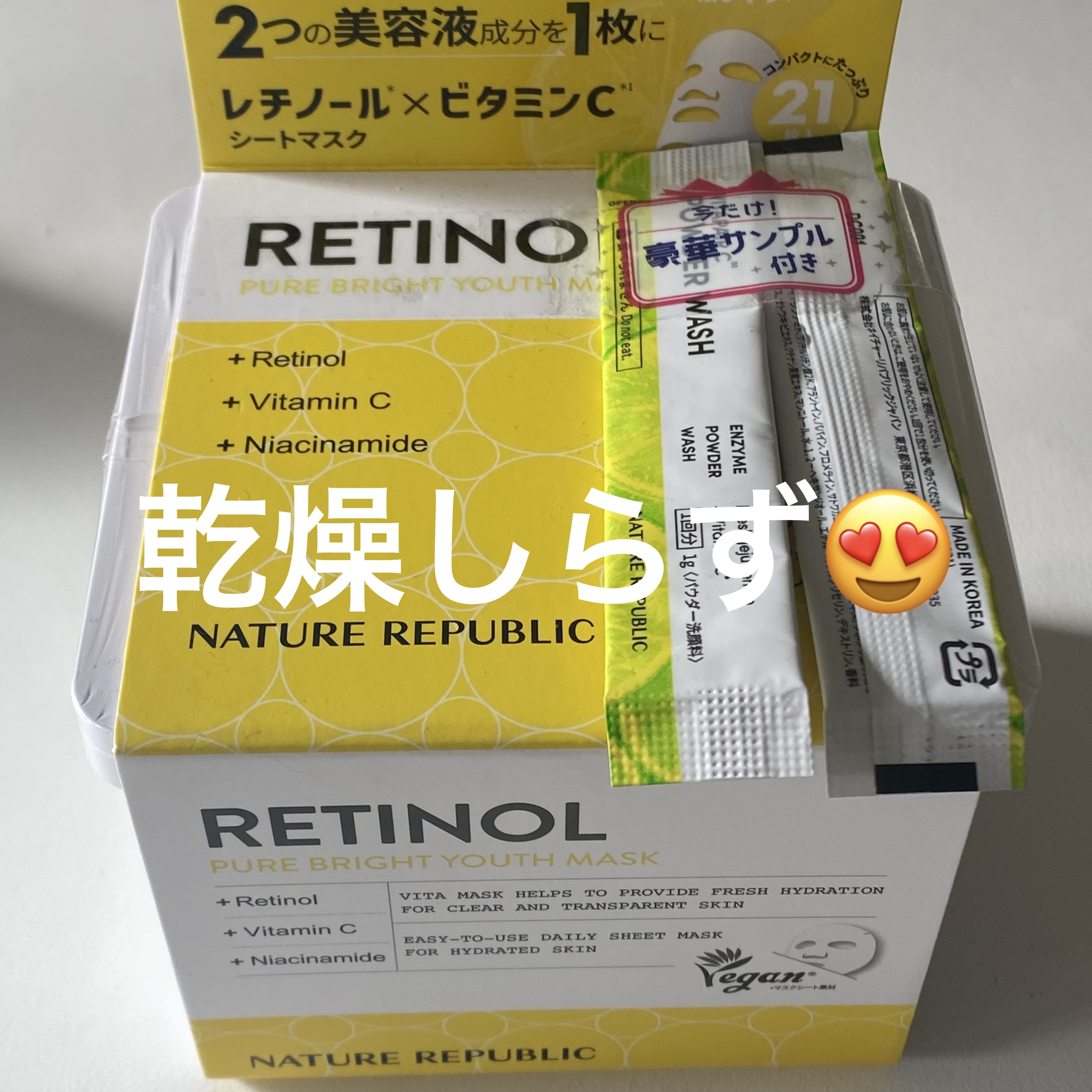 ネイチャーリパブリックのキューブマスク🟨・レチノールピュアブライトユースシートマスクヴィーガンのシートマスクにウォータータイプの美容液がヒタヒタに染み込んでいて、角質層のすみずみまでぐんぐん浸透💛くすんだお肌もワントーンアップしました✨レチノ...