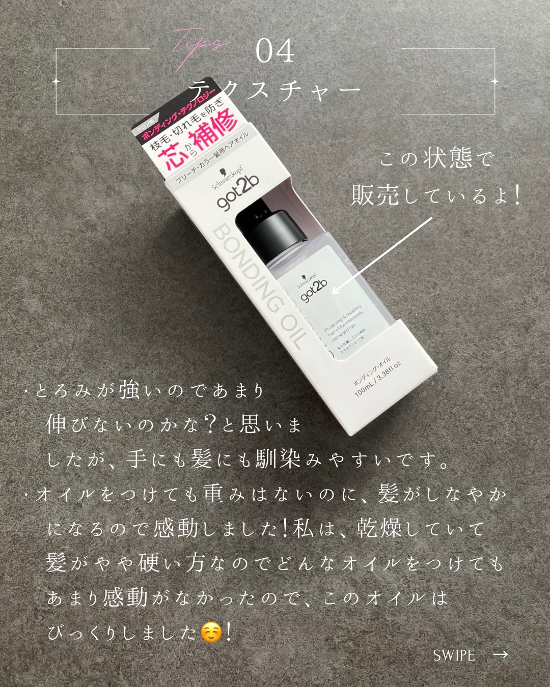 ブリーチオンカラー売上No.1ブランド「got2b(ゴットゥービー)」から発売したハイダメージ髪用のヘアオイル サロン級の集中補修を叶えます。ベタつきのない使い心地で芯から髪を補修して、枝毛・切れ毛を防ぎ、しなやかで毛先までまとまりのある指通りのよい”うるとうる髪”へ導きます。 アップル&ホワイトムスクの香りを基調に、甘さをほのかに感じるホワイトムスクの香り