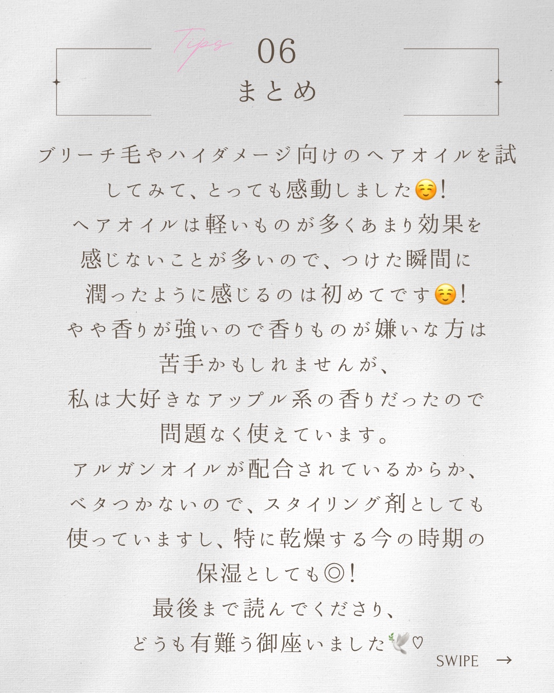 | ヘアケア・スタイリングランキング第23位 | いいオイル!ブリーチで傷んでる髪もまとまってくれる♡指通りサラサラ♡ | 詳細を見る | |