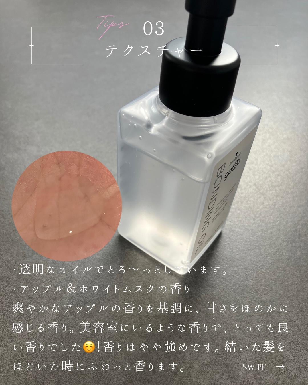 - サロン級の集中補修!ハイダメージ髪用ヘアオイル ブリーチやカラーを繰り返したハイダメージ髪向けに開発 〇サロン発のボンディング・テクノロジーを搭載。芯から補修・髪を保護し、毛先までうるとぅる髪へ 〇3種類のボタニカルオイル(植物由来のアルガンオイル*¹、ピーチシードオイル*²、アピニシアンオイル*³)配合。パサつきの気になるダメージ髪に保湿と上質なツヤを与えます 〇パラベンフリー&無着色 〇アップル&ホワイトムスクの香り *¹アルガニアスピノサ核油 (保湿) *²モモ核油(保湿) *³クランベアビシニカ種子油(保湿)