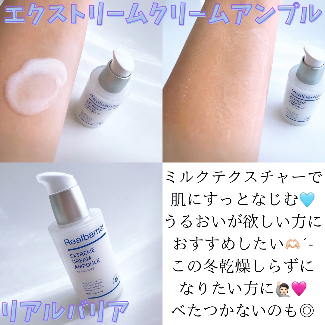 リアルバリアのエクストリームクリームアンプルです🤗 パンテノール、オメガセラミド(※保湿成分)配合🫧 乾燥が気になる方におすすめです☃️ しっとりするのにベタつかないテクスチャーです🌸 シリーズで使うのもよさそうです✨ ぜひチェックしてみてね🥰
