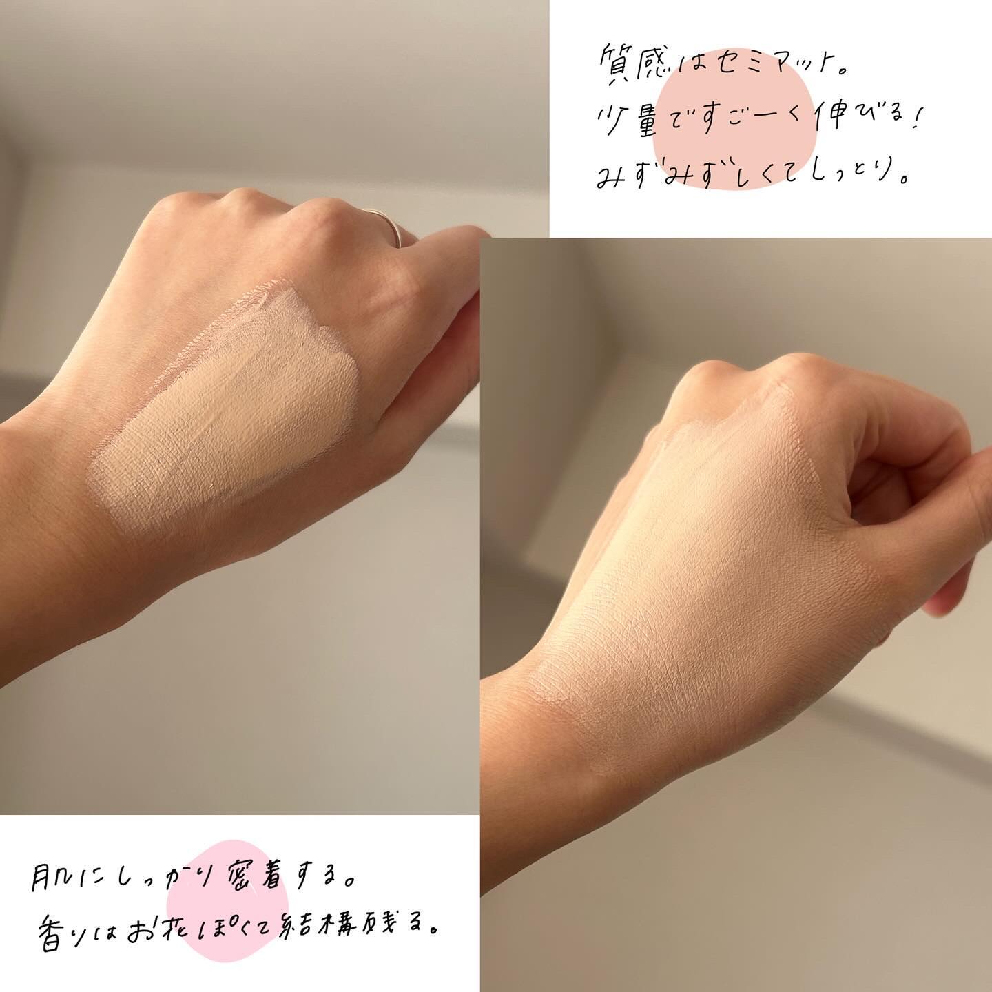 カバー力は高いのに透け感のある仕上がりで、“フロストマット“肌になる☺︎ 新作の方がジェル質感でピタッと肌に留まる伸び方をする。 色は102を買ってみた。フローレスカバレッジの100と比べると少し暗く感じるんだけど、肌に乗せると本当に自然に馴染んで良い感じになった💐 ただ容器はこちらがめっちゃくちゃ軽いし液垂れもしないし使いやすいので気に入ってる🙆