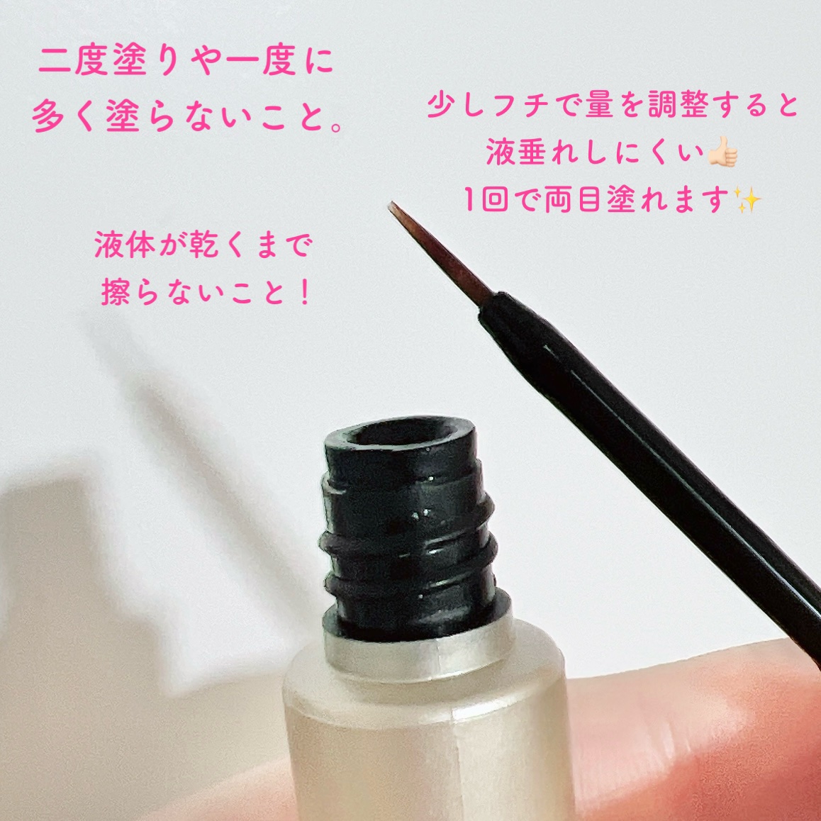 まつ毛に直接塗るのではなくて、リキッドアイライナーを塗るようにまつ毛の生え際に塗るタイプだよ!! ブラシは細めで狙ったところに塗りやすかった◎ 個人的に期待大なまつげ美容液✨️