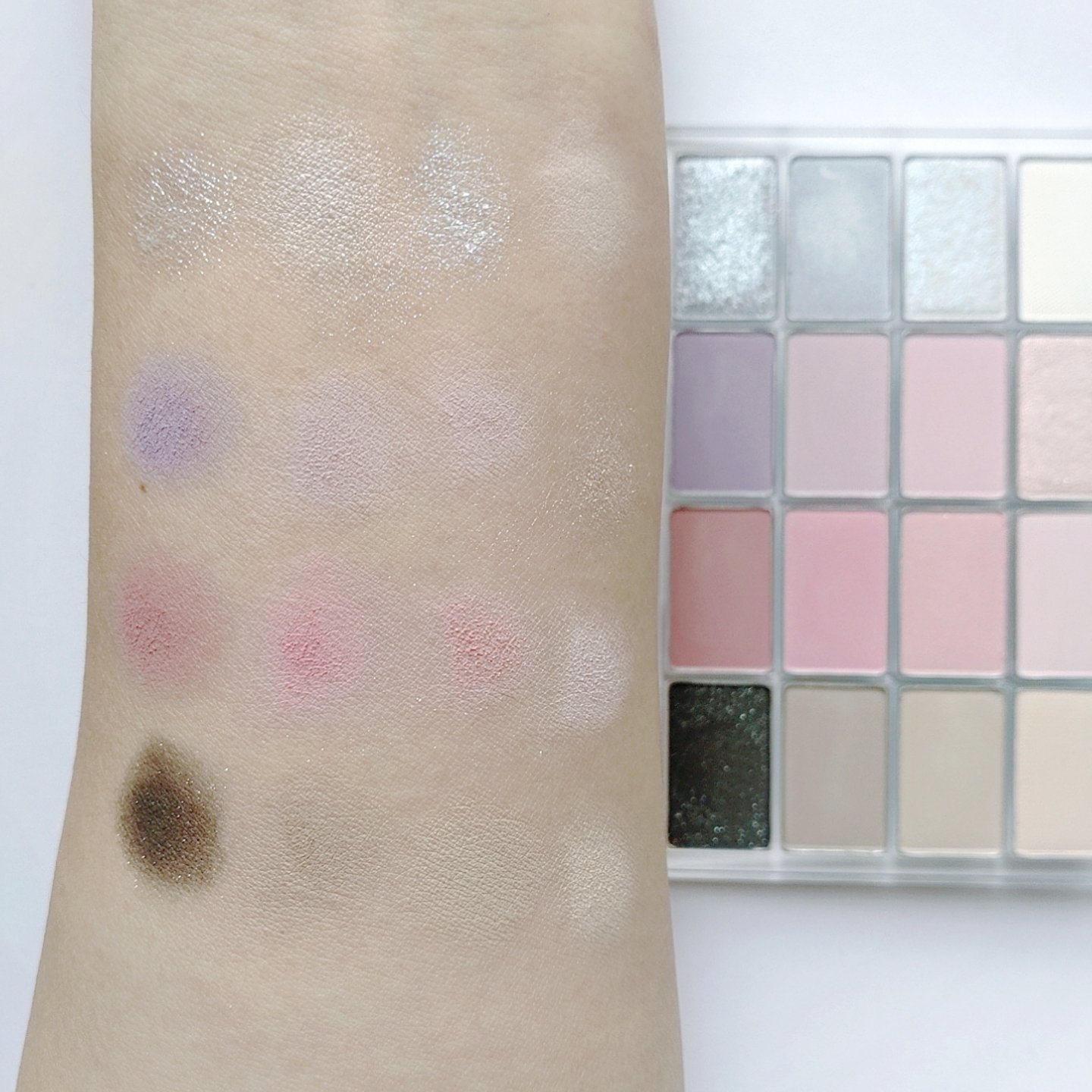 プチプラのクオリティじゃないっ!! 発売前からチェックしていたけれど、ここまで可愛いとは…😆 絶妙カラーで目もとのくすみを飛ばして*明るい印象に🩷 横割りグラデーションでメイクし、立体感をより出したかったので最後に1番左のカラーを上まぶたの真ん中と涙袋にのせています🙆 肌馴染みも良くて粉飛びも感じにくかったです💕 ブラウンの方も店頭に出てたら買おうかな💓