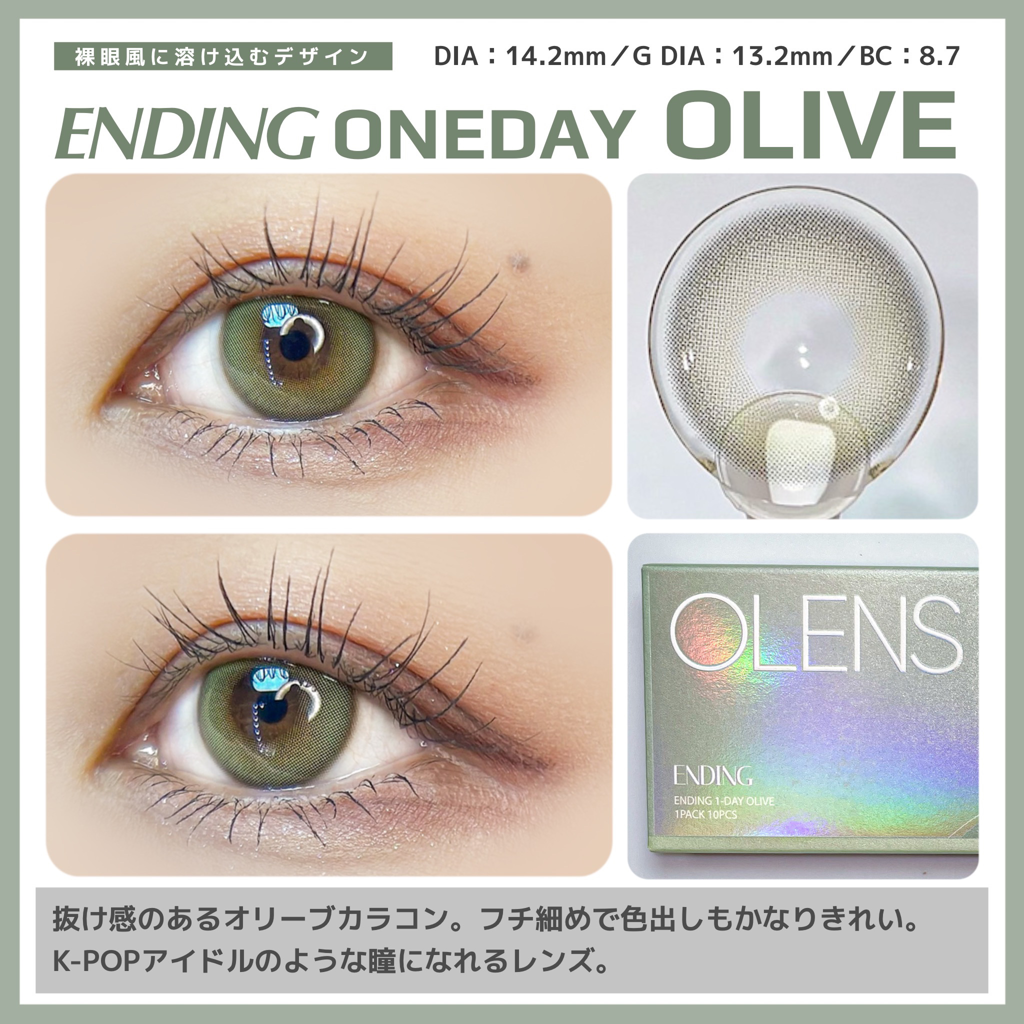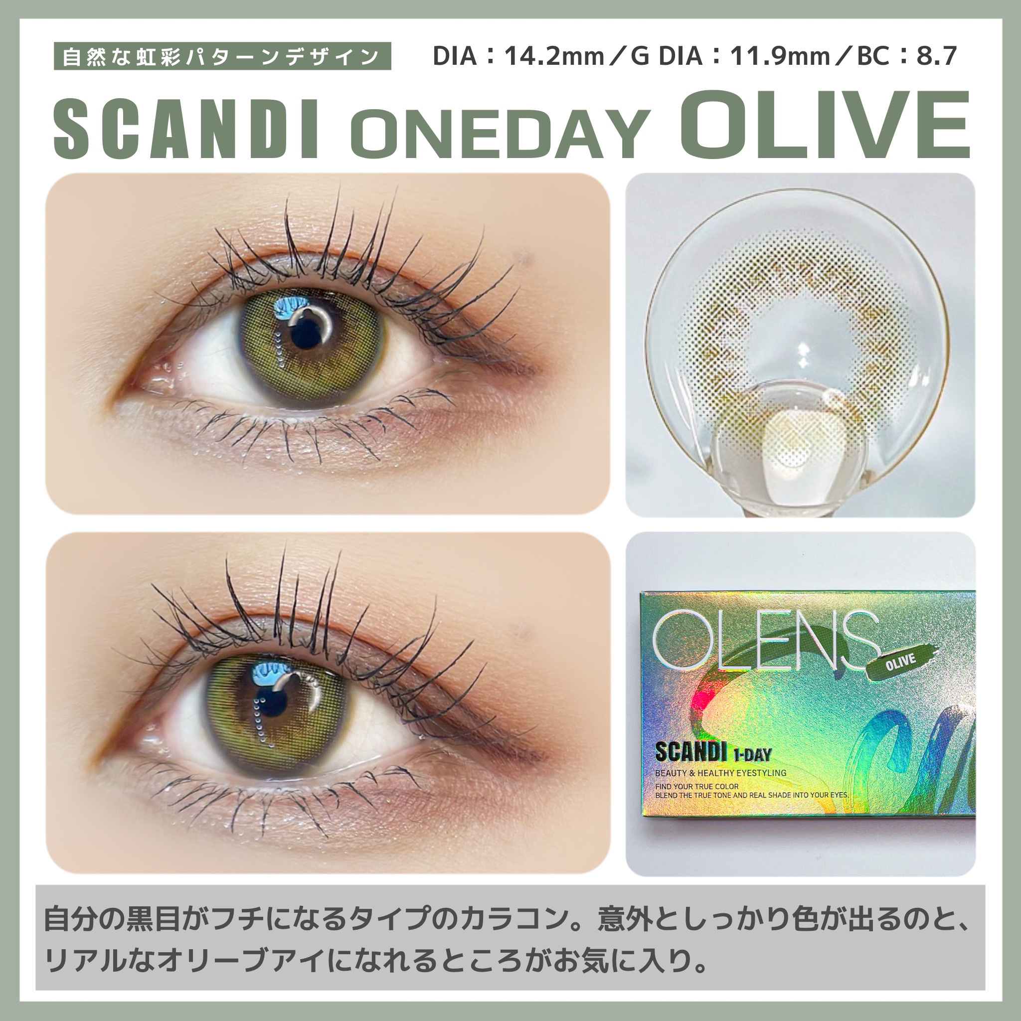 このオリーブはコスプレ感もなく使えて、浮かずに馴染むから可愛いよーー🍀 やっぱりGlowyが1番すき。 裸眼風に溶け込み神秘的な印象しっかりオリーブ感だしたいならこれ。