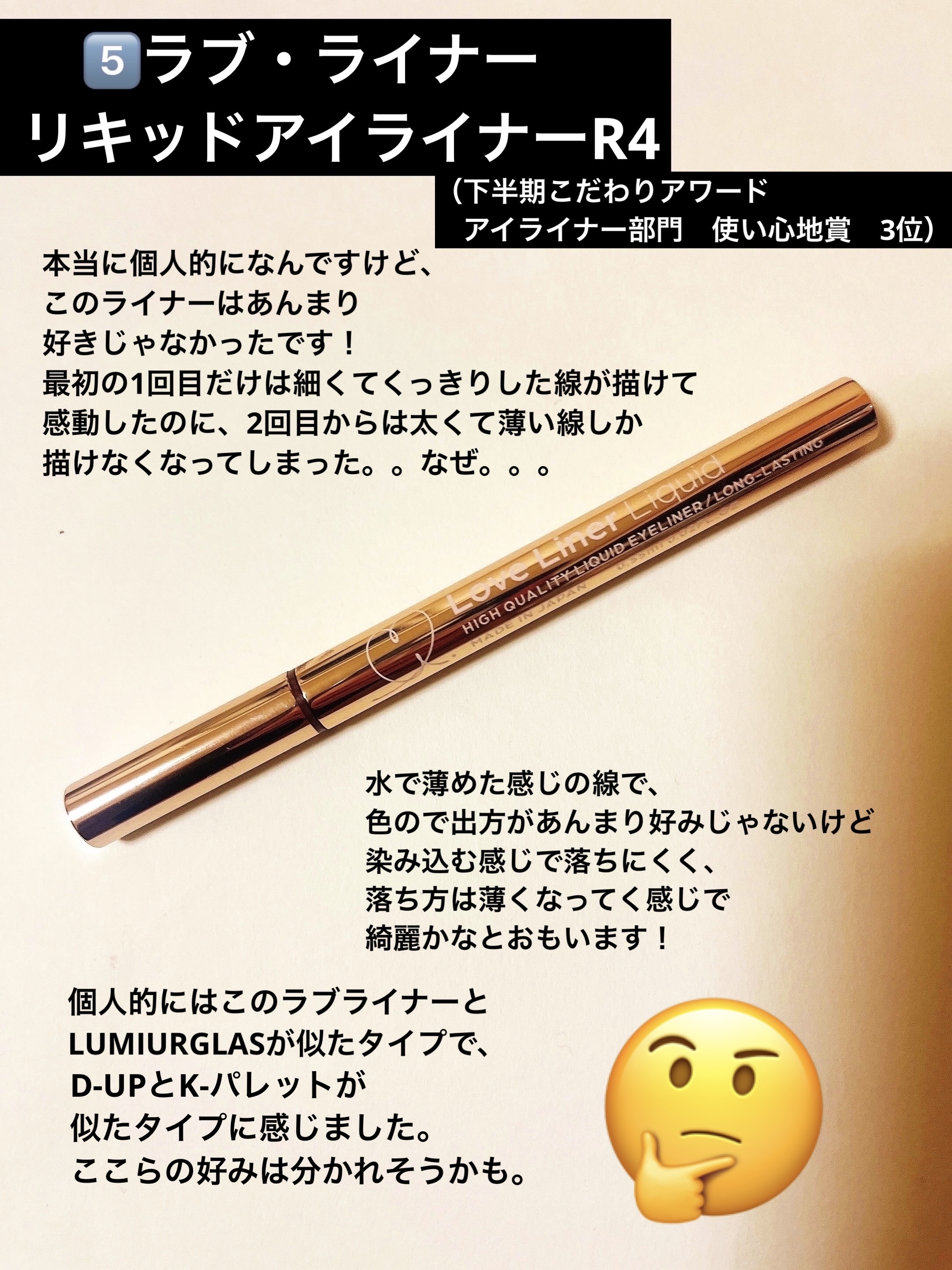 | メイクアップランキング第60位 | ラブライナーのアイライナーってほんと描きやすいから好き!重みのあるアルミボトルもお洒落な上に使いやすい | 詳細を見る | |