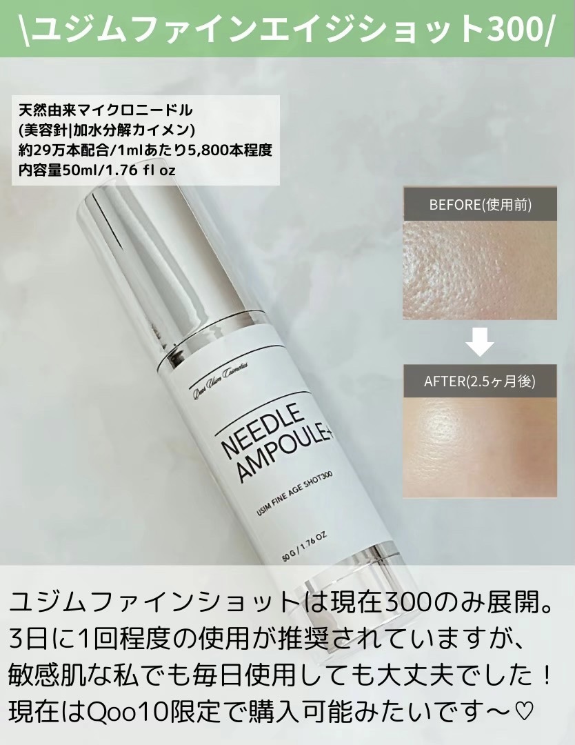 ユジムのファインエイジショット✨ Qoo10限定で4,500円 💎天然由来29万本マイクロニードル 💎8種類の分子化ヒアルロン酸 💎低分子化されたコラーゲン 使った翌日肌のハリを実感できるし、商品名に「エイジ」ってついてるだけあって、目元のシワやたるみの改善効果も確認されているから、エイジングサインが目立つお肌にもオススメ! 週3回、2週間の使用で毛穴への効果やトーンアップ効果や肌鎮静効果が認められているから、割とすぐ肌変化を実感できる‼️