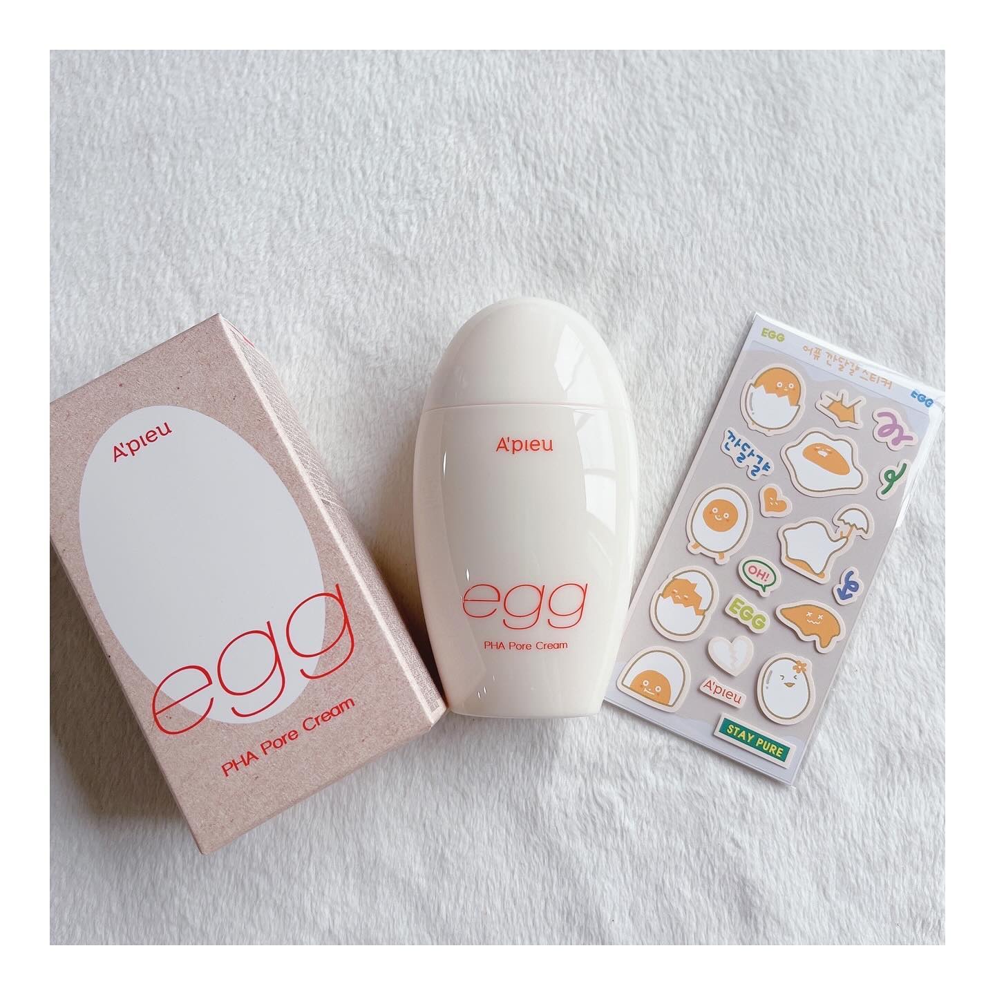 A'pieuの毛穴レスむき卵肌クリームです! @apieu_cosmetics ナイトスキンケア、化粧前スキンケアなどすべての場面で使用可能です! 3つの主要成分がカギです! ①成分PHA、アンチセボムP(Antisebum pore):皮脂、角質ケア ②成分ナイアシンアミド:着色汚れ落とし ③成分卵白(アルブミンエキス):垂れた毛穴を引き締める テクスチャーはベタつかずしっとりとした仕上がりになります! たまご型のこの形もかわいくて、おまけのステッカーで飾ることもできます!