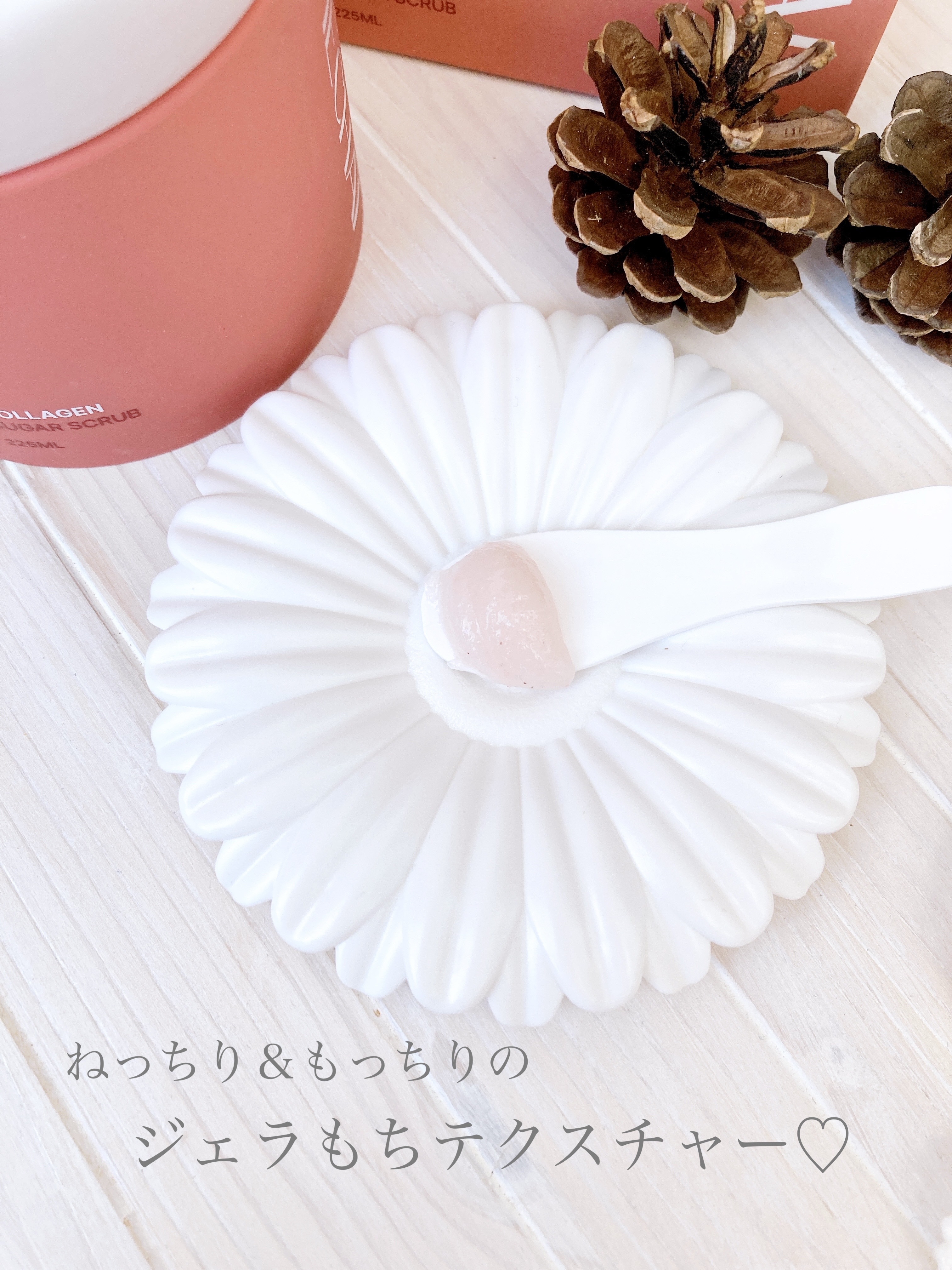 質感はジェラート+お餅みたいなジェラもちテクスチャーで伸びーる!!見た目は完全桜もち🌸きゃわ💕 細かな角質ケアと保湿力に特化してて使用してるとだんだんポカポカ温かくなってくるよ❤️🔥 香りがたまらん!ピーチブリーズという香りなんだけど私はベリー系に感じたよ🍓🫐