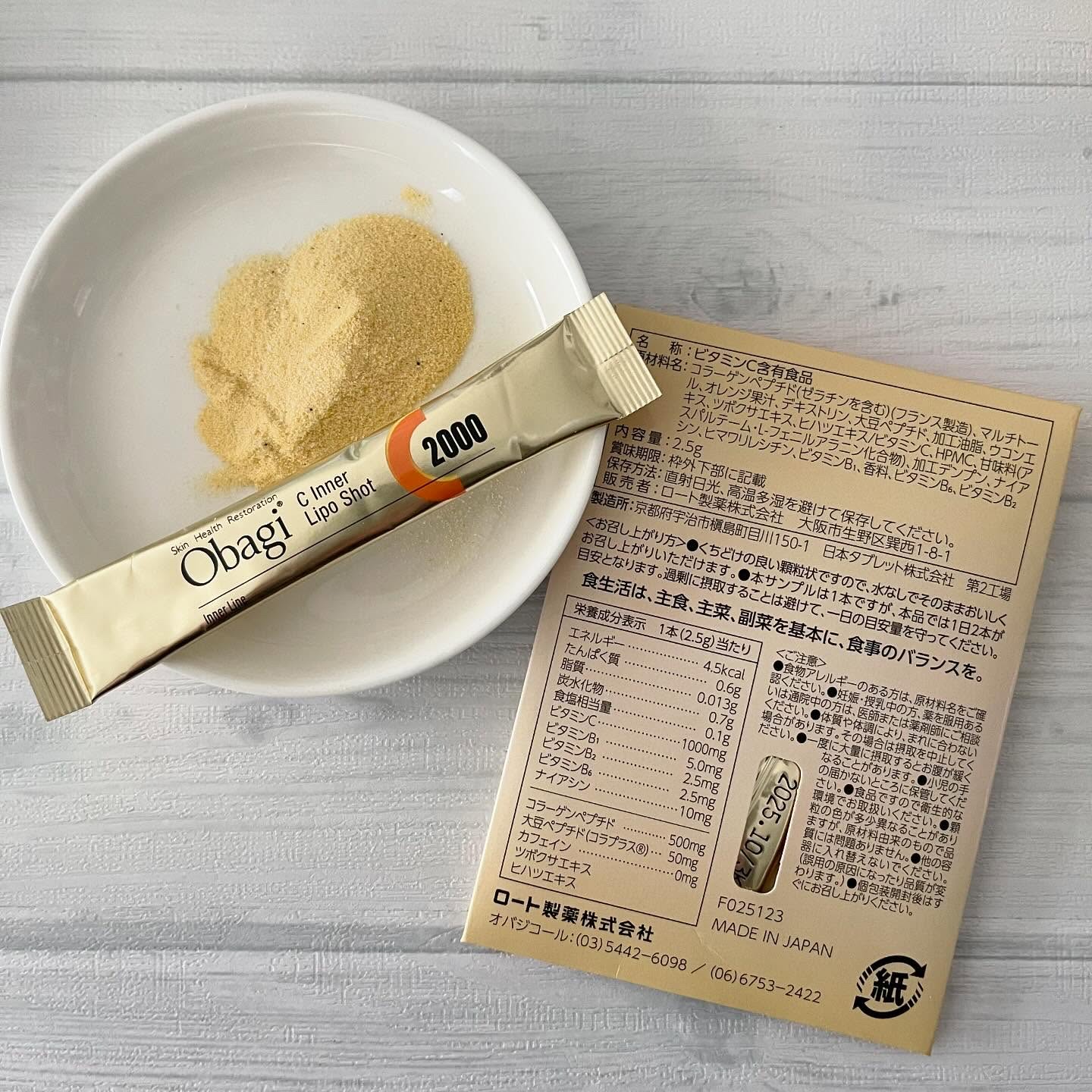 オバジC インナーリポショットは、1日2本が目安となっている、ビタミンC含有食品です。 グレープフルーツ風味で、顆粒タイプです。オバジ独自ブレンド「リポショットC」*配合です。 結構しっかりと酸味を感じるので、酸味にお強い方に良さそうです。