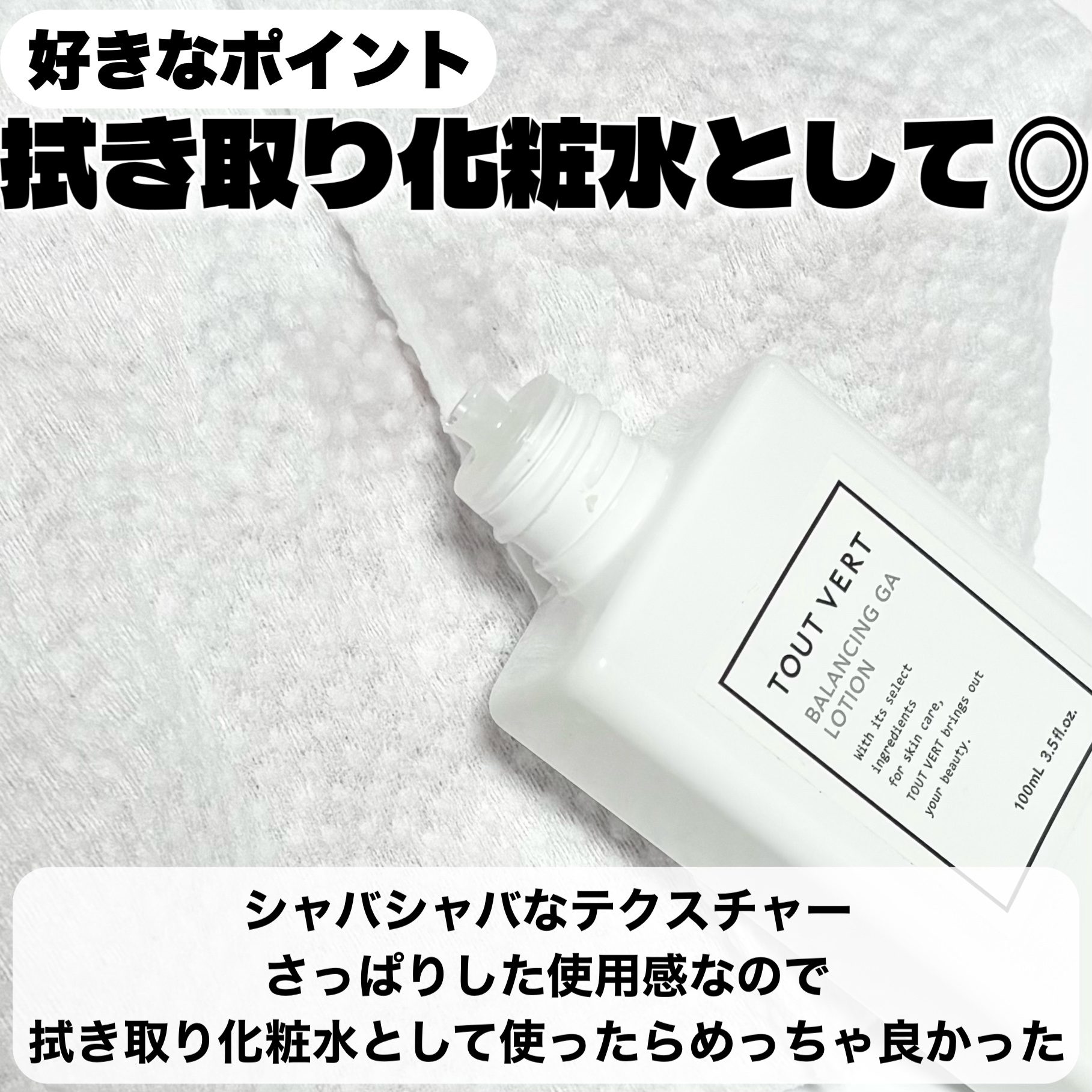 TOUTVERTバランシングGAローション 100ml¥2,000(税込)[香り]なし[良かった点]・刺激なし[微妙な点]・特に効果を感じなかった〜感想〜口コミがよかったので購入しました!毎日使い続けて使い切りましたが、効果をあまり感じること...