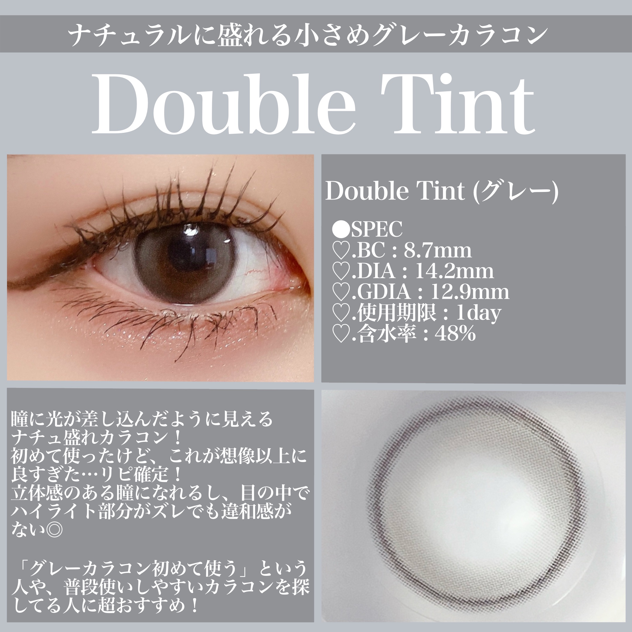 \黒髪さんにおすすめ🖤水光カラコン🫧/どちらも黒髪に映える、ブラック•グレーの1dayレンズ💖ハイライト部分が光を吸収してくれるから、ちゅるんちゅるんに立体的に見える🥰着色直径も大きめで盛れます!透明感たっぷりのカラーで、特に黒髪さんにおすす...
