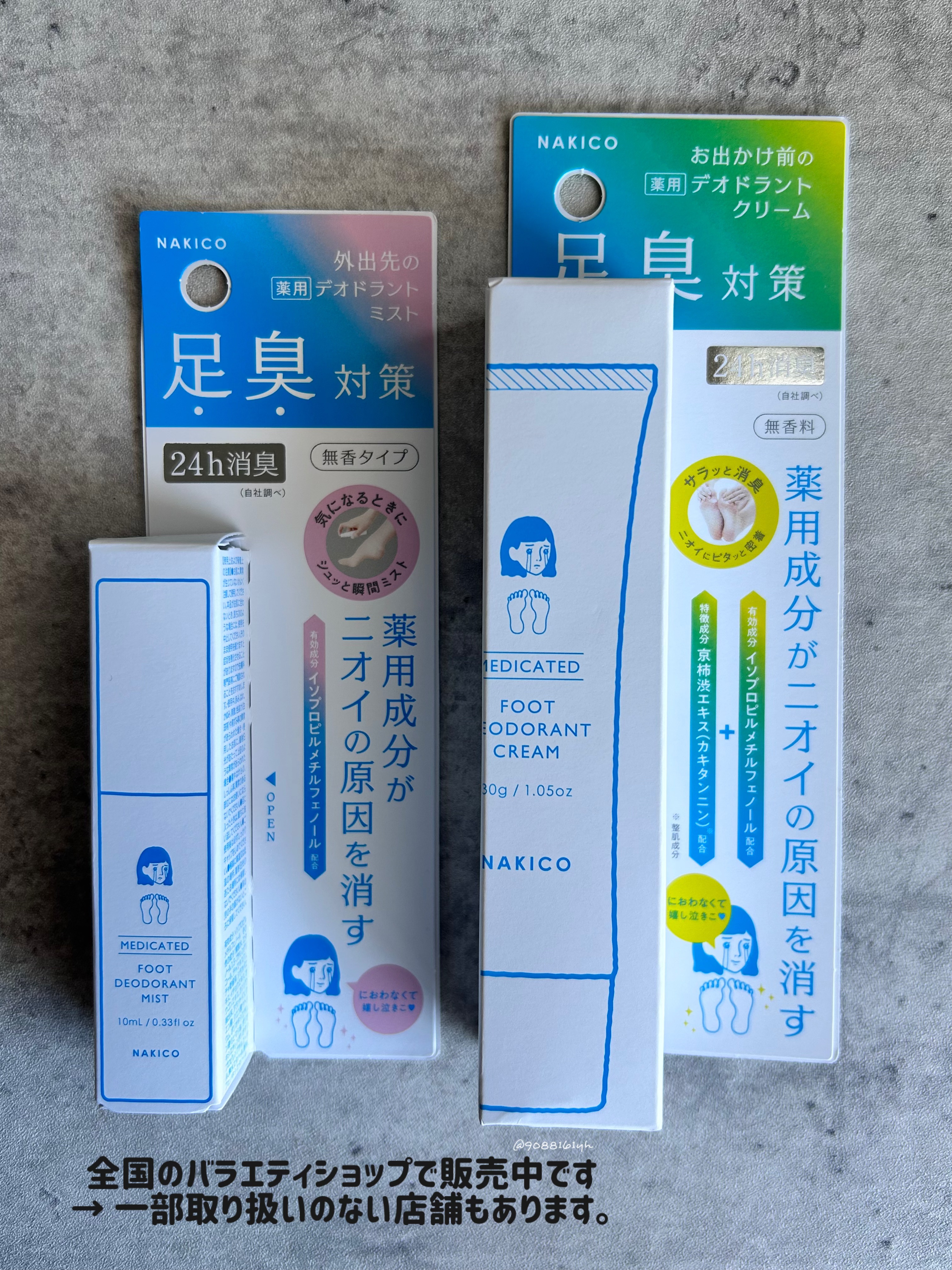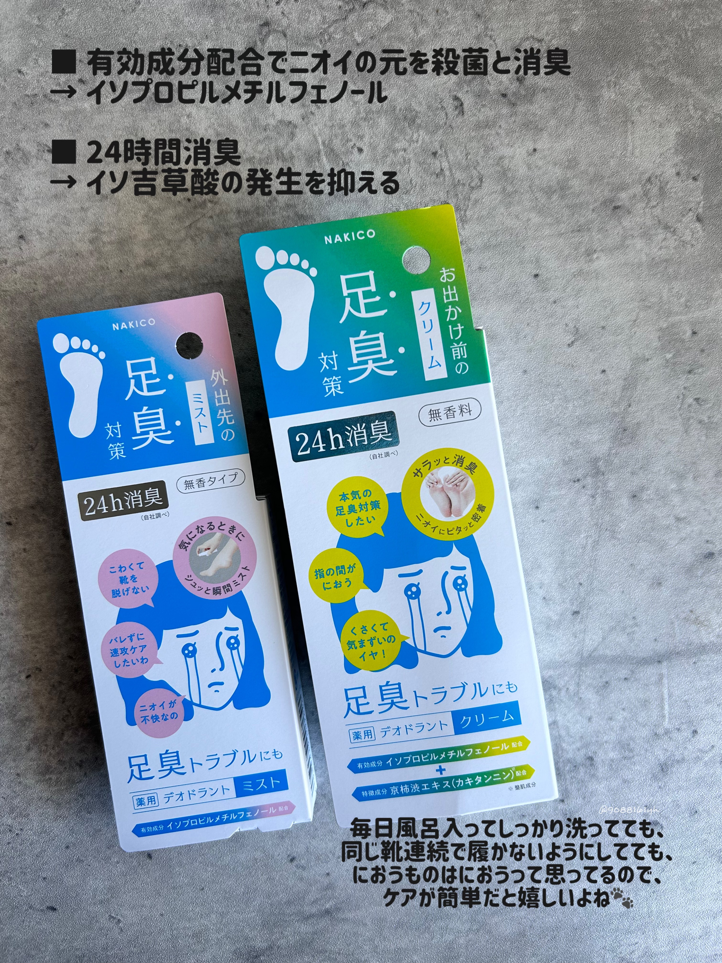 新商品の足臭対策シリーズ 👣薬用デオドラントフットクリーム 👣薬用デオドラントフットミスト 💡有効成分「イソプロピルメチルフェノール」 ニオイの元を殺菌・消臭! 外出前に 》》お手軽つるすべフットクリーム。足指の間に塗りやすいサラサラでベタつかないクリームタイプで足に一日中密着キープ。