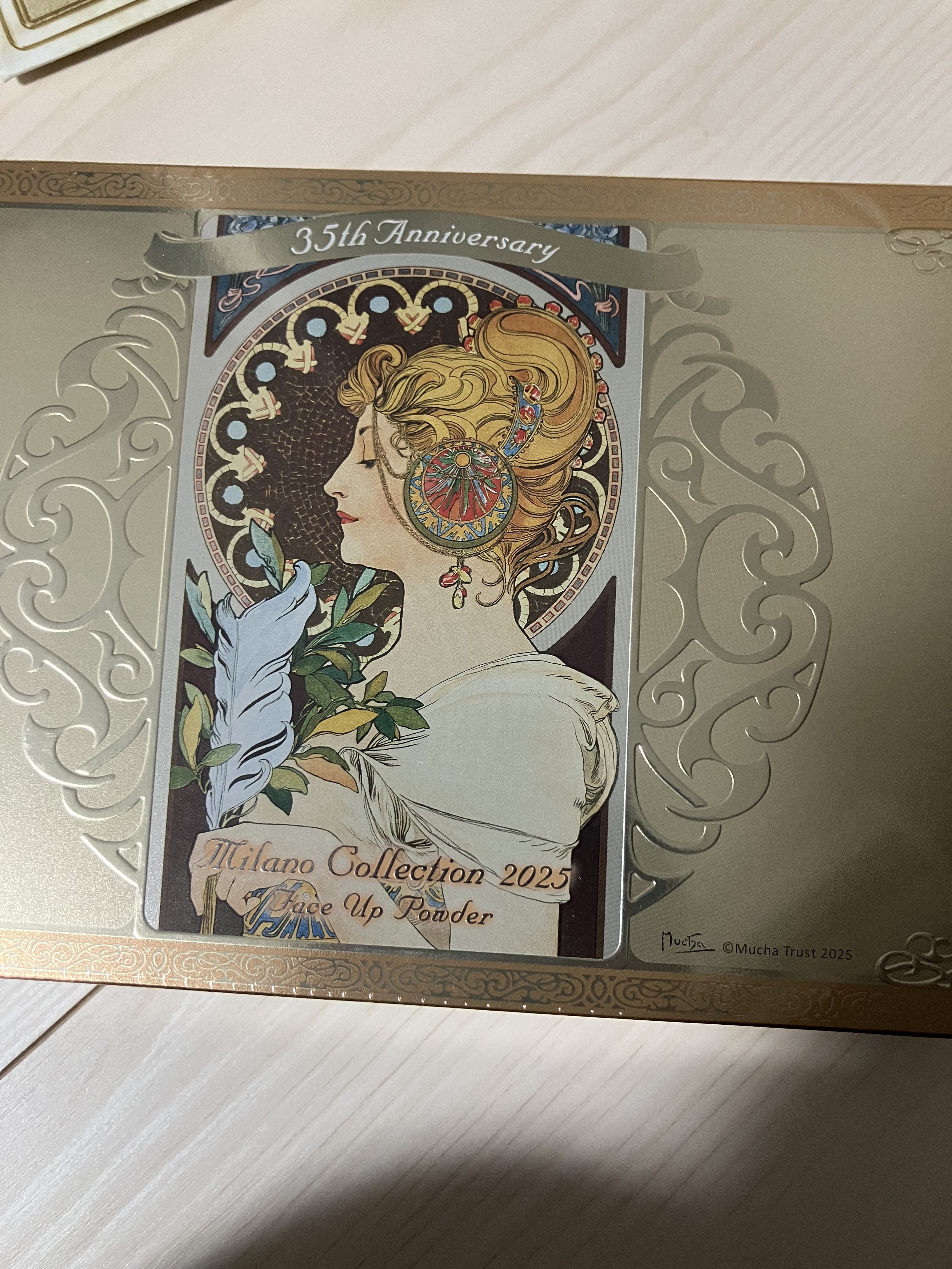 - 数量限定発売 ブランド誕生35周年を迎える今、絶大な人気を誇るミュシャ作品「羽根」とコラボレーション。 繊細な輝きを秘めた透明感。しっとり心地よい感触で肌を包み込み、ベールをまとったようなキメ細かい肌に仕上げる高機能フェースパウダー。 ファンデーションを優しくフィットさせ、つけたての美しさを持続。「満たす幸せ」をテーマに、ミュシャの華麗な作品とミラノコレクションの技巧を凝らした造形美が見事に調和したデザイン。 ヒアルロン酸、ローヤルゼリーエキス、ローズマリーエキス配合(保湿) 2024年5月21日 予約受付開始 2024年11月23日 数量限定発売