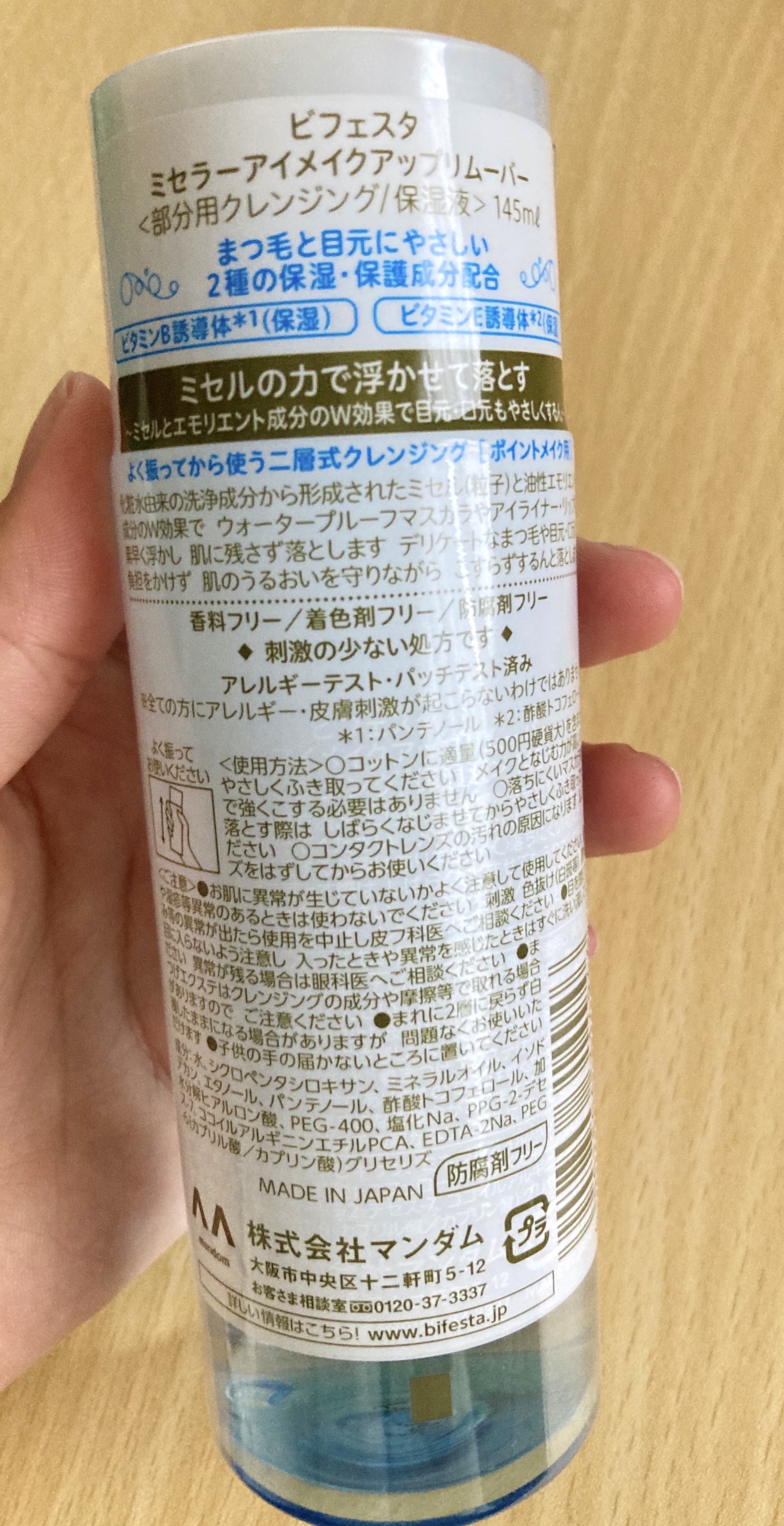 ビフェスタから商品提供を頂きました。ビフェスタミセラーアイメイクアップリムーバー容量:145mlウォータープルーフマスカラや落ちにくいリップメイクも素早く落とす2層式ポイントメイクリムーバー。濃いメイクを浮かせる油性エモリエント層と、油を包み...