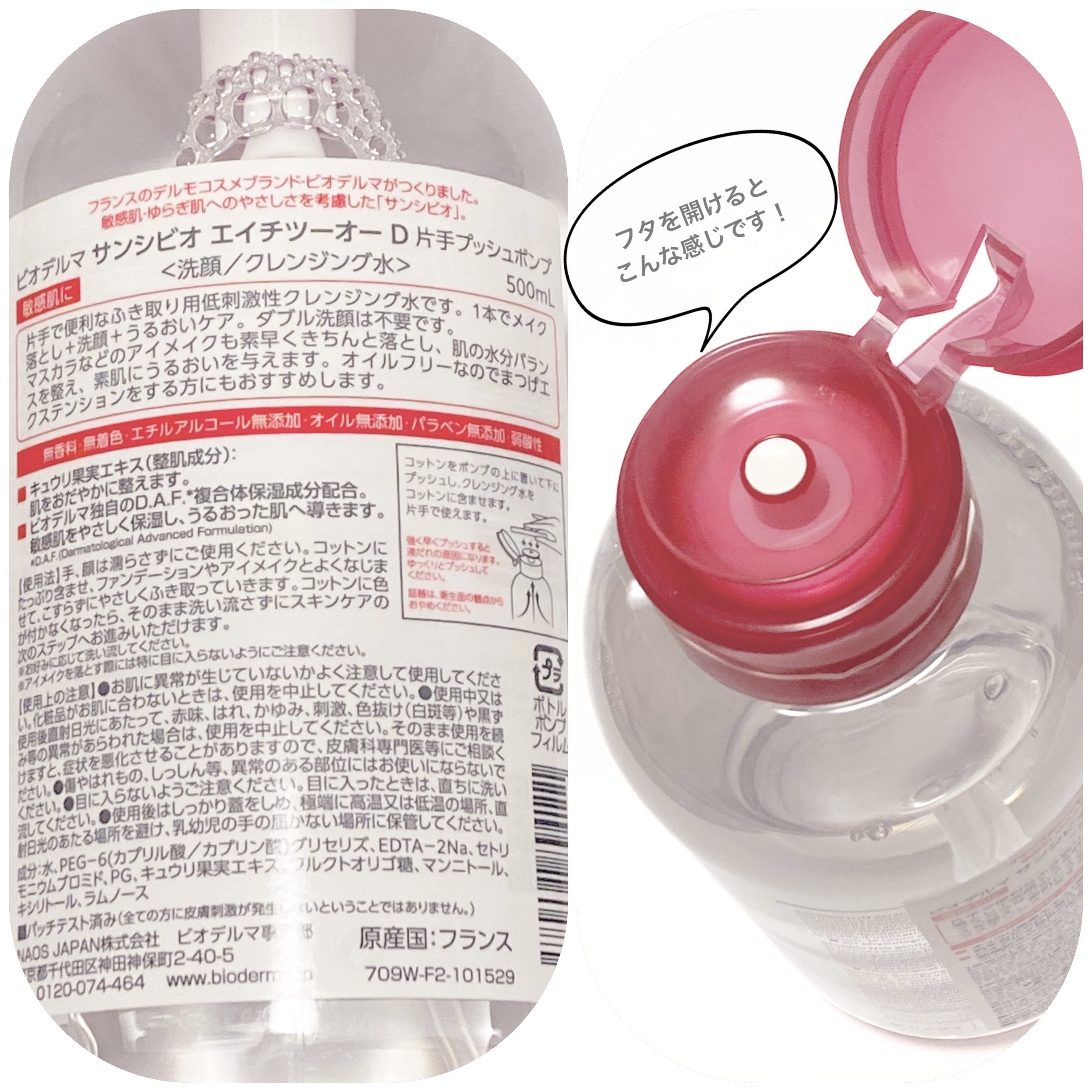 - ※2025年11月下旬〜250ml・500mlの商品パッケージを順次リニューアル。尚、これにかかる商品の返品・交換は承っておりません。 肌にやさしい使い心地で、マスカラなどのアイメイクも素早く落とします。 敏感肌さんも、面倒くさがりやさんも!手放せない!時短クレンジング水! コットンでふき取るだけ。1本でメイク落とし+洗顔+うるおいケア。 マスカラなどのアイメイクもきちんと落とし、肌の水分バランスを保ち、素肌にうるおいを与えます。 ■キュウリ果実エキス(保湿成分): 肌を整えます。 ■ビオデルマ独自のD.A.F.*複合体保湿成分配合。 敏感肌をやさしい使い心地で保湿し、うるおった肌へ導きます。 *D.A.F.(Dermatological Advanced Formulation) 保湿成分: マンニトール、キシリトール、ラムノース
