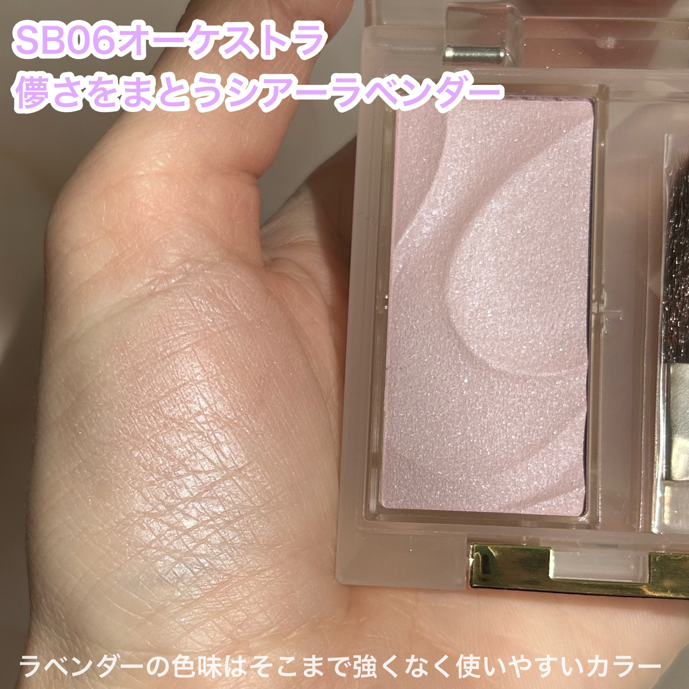 - <SB01 シーショア> タルク、トリエチルヘキサノイン、窒化ホウ素、ポリグリセリル-3ポリジメチルシロキシエチルジメチコン、ラウリン酸亜鉛、トリメチルシロキシケイ酸、メチルトリメチコン、ステアリン酸ソルビタン、セラミドNP、スクワラン、ホホバ種子油、オリーブ果実油、トコフェロール、メチルパラベン、(+/-)グンジョウ、マイカ、酸化チタン、酸化鉄、水酸化Al、赤202、赤226 <SB02 シスター> タルク、トリエチルヘキサノイン、窒化ホウ素、ポリグリセリル-3ポリジメチルシロキシエチルジメチコン、ラウリン酸亜鉛、トリメチルシロキシケイ酸、メチルトリメチコン、ステアリン酸ソルビタン、セラミドNP、スクワラン、ホホバ種子油、オリーブ果実油、トコフェロール、メチルパラベン、(+/-)グンジョウ、マイカ、酸化チタン、酸化鉄、水酸化Al、赤202、赤226 <SB03 ミモレット> タルク、トリエチルヘキサノイン、窒化ホウ素、ポリグリセリル-3ポリジメチルシロキシエチルジメチコン、ラウリン酸亜鉛、トリメチルシロキシケイ酸、メチルトリメチコン、ステアリン酸ソルビタン、セラミドNP、スクワラン、ホホバ種子油、オリーブ果実油、トコフェロール、メチルパラベン、(+/-)グンジョウ、マイカ、酸化チタン、酸化鉄、水酸化Al、赤202、赤226 <SB04 トースト> タルク、トリエチルヘキサノイン、窒化ホウ素、ポリグリセリル-3ポリジメチルシロキシエチルジメチコン、ラウリン酸亜鉛、トリメチルシロキシケイ酸、メチルトリメチコン、ステアリン酸ソルビタン、セラミドNP、スクワラン、ホホバ種子油、オリーブ果実油、トコフェロール、メチルパラベン、(+/-)グンジョウ、マイカ、酸化チタン、酸化鉄、水酸化Al、赤202、赤226 <SB05 ワルツ(限定)> タルク、トリエチルヘキサノイン、ステアリン酸ソルビタン、窒化ホウ素、ポリグリセリル-3ポリジメチルシロキシエチルジメチコン、ラウリン酸亜鉛、トリメチルシロキシケイ酸、メチルトリメチコン、セラミドNP、スクワラン、ホホバ種子油、オリーブ果実油、トコフェロール、メチルパラベン、(+/-)グンジョウ、ホウケイ酸(Ca/Al)、マイカ、金、酸化チタン、酸化鉄、水酸化Al、赤226 <SB06 オーケストラ(限定)> タルク、トリエチルヘキサノイン、ステアリン酸ソルビタン、窒化ホウ素、ポリグリセリル-3ポリジメチルシロキシエチルジメチコン、ラウリン酸亜鉛、トリメチルシロキシケイ酸、メチルトリメチコン、セラミドNP、スクワラン、ホホバ種子油、オリーブ果実油、トコフェロール、メチルパラベン、(+/-)グンジョウ、ホウケイ酸(Ca/Al)、マイカ、金、酸化チタン、酸化鉄、水酸化Al、赤226