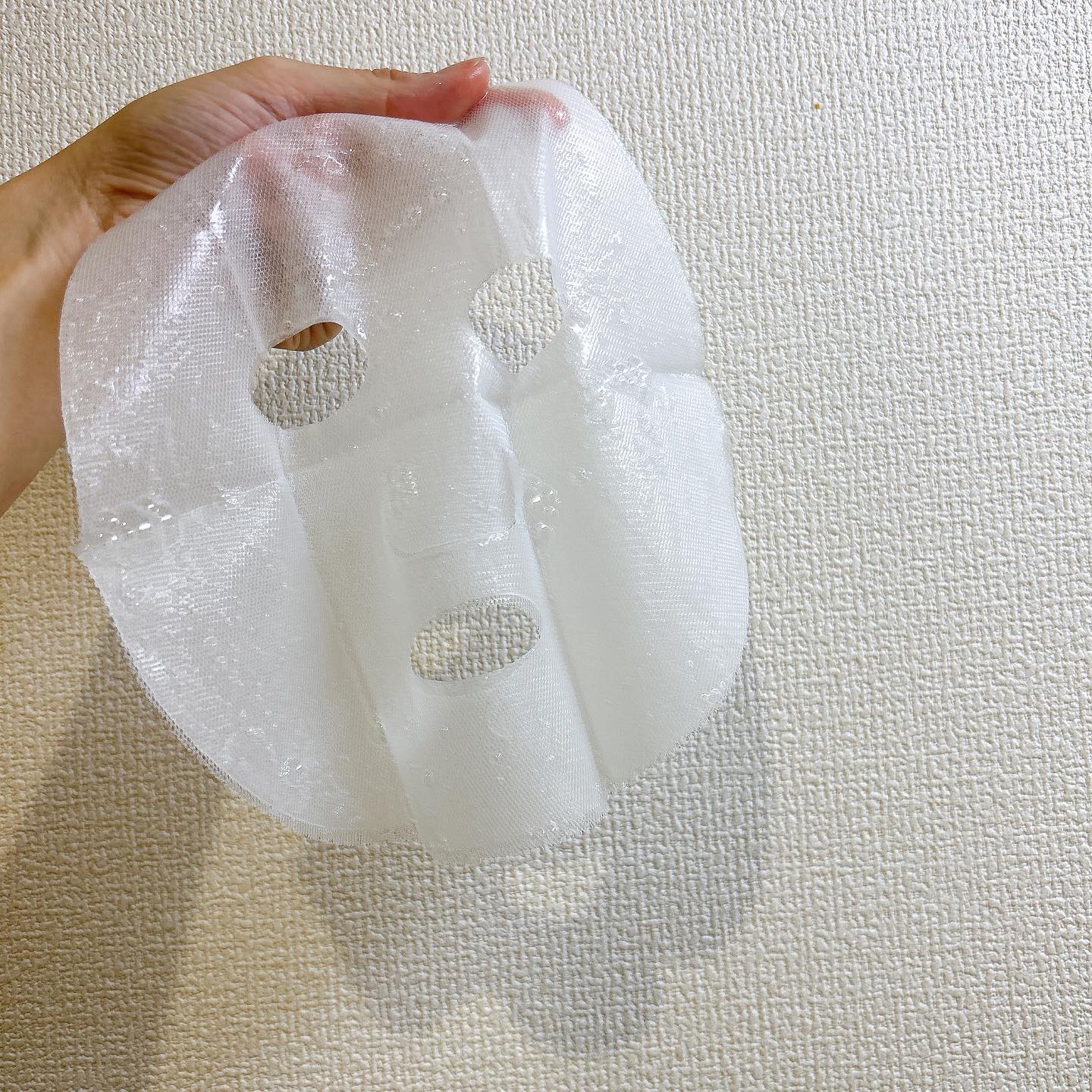 顔にフィットしやすい柔らかいシート。メッシュが挟んで畳んであるので、柔らかくても取り扱いはしやすいです✨ 液は糸引くとろみがついていて、パックを取り出した後のエッセンス量もたっぷりでびっくり! パック後はクリームなどなしで寝てもベタつかずにしっとりもっちりでした🤍