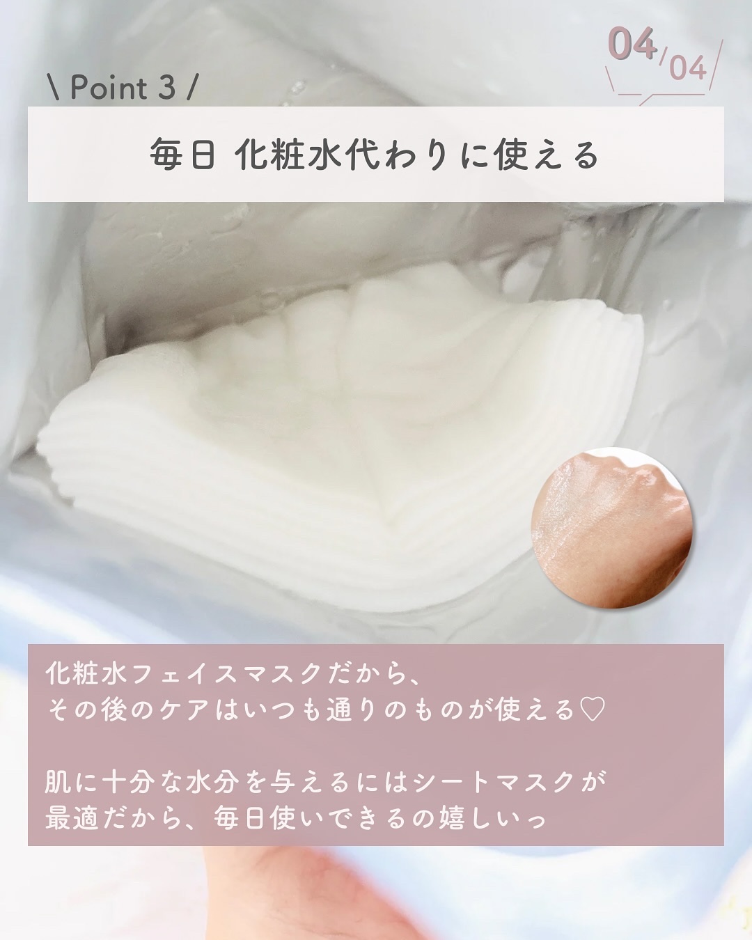 | やわらかい感触のシート♪ たっぷりの化粧水が含まれているのが分かるくらい うるうるしています😊 | 詳細を見る | |