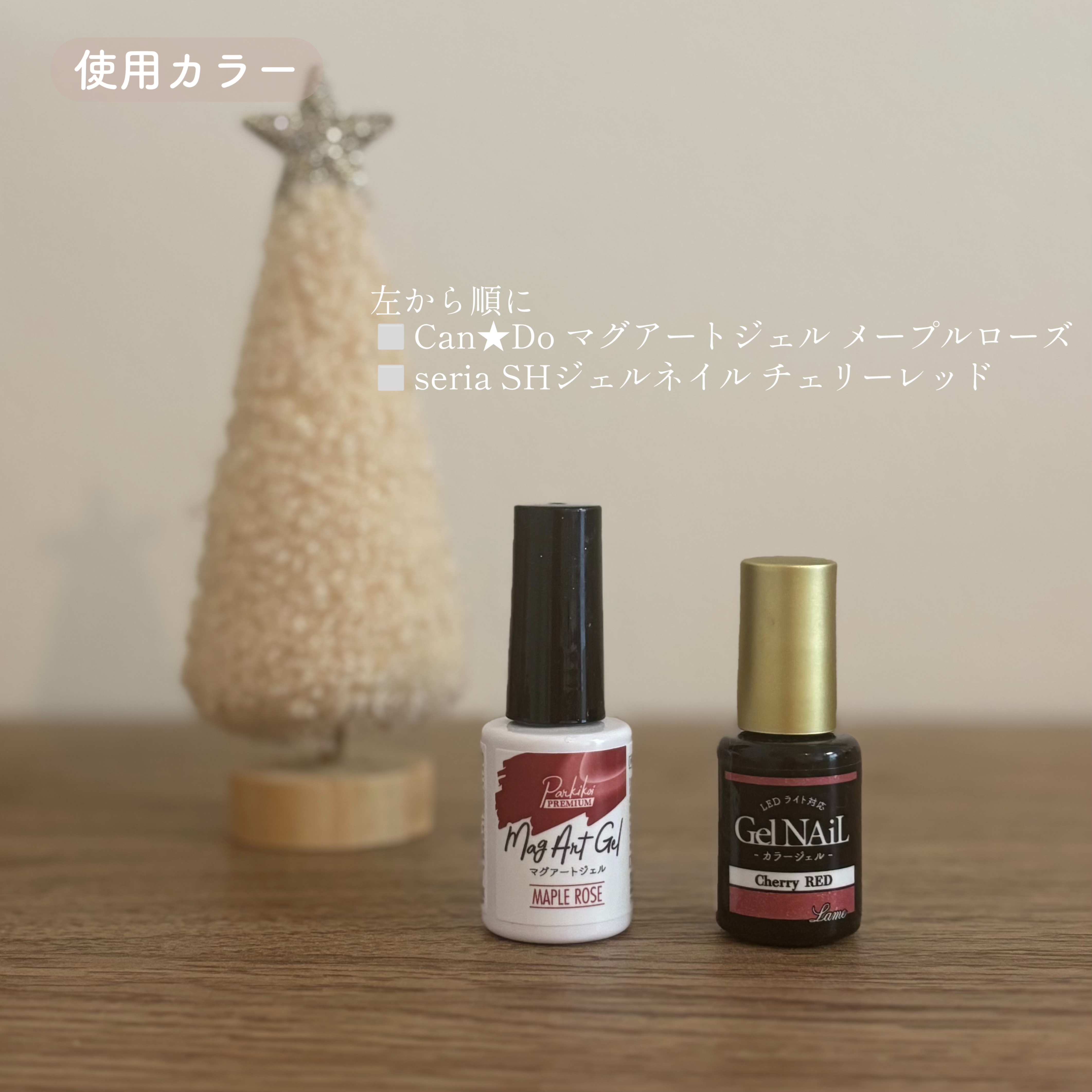 久しぶりにSeriaでジェルネイルポリッシュを買いに行ったらマグネットジェルを発見! ためしにDAISOの21ブラウンレッドを重ねてみたら冬にぴったりな深いブラウンレッドマグネイルが完成しました👀🩷 セリアマグはめちゃくちゃ細かいラメがぬるぬる動くのですごくぷるん感が出て可愛いし、ダイソージェルは透け感たっぷりで重ね使いしやすくて◎ マグネット🧲さえ持っていればちょー簡単! おすすめの組み合わせです!