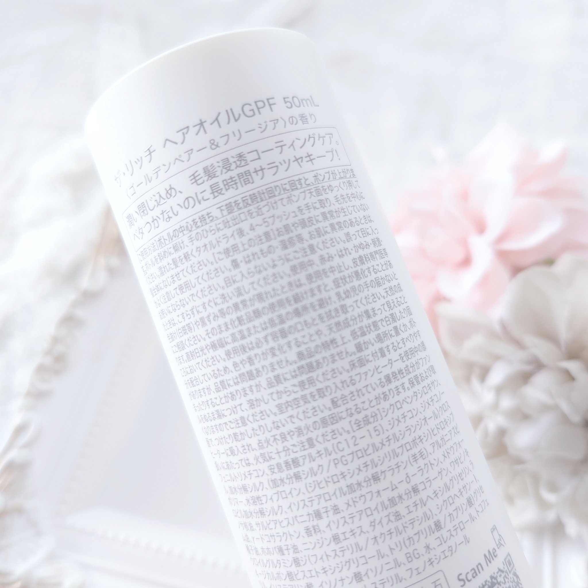 シルクの魅力を最大限に引き出した香るアウトバスヘアオイルです。ナノサイズのシルク水溶液配合によりしっかり内部から補修し、こだわりのオイル処方で外部補修、コーティング。自宅でも毎日サロン帰りのような、香るサラツヤヘアーが叶います。 ゴールデンペアー&フリージアの香りが翌朝まで続きます。オイルなのにさらさらでベタつきもなく良き。香りは香水のようなフリージアの香り。 ボトルもシンプルでスライドするとポンプが出てきてスタイリッシュ。値段もちょうど良くプレゼントにもいいかも。