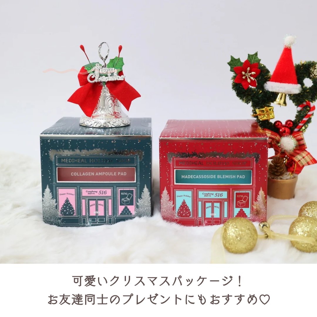 クリスマス使用のパケ可愛いすぎるよねー♡ パッドは67mmと大きめのパッド 丸みのあるスクエア マデカソサイド ツボクサを2回抽出して配合量2倍UP お肌の悩みに合わせて全7種類! 🎄ホリデーエディションは3種