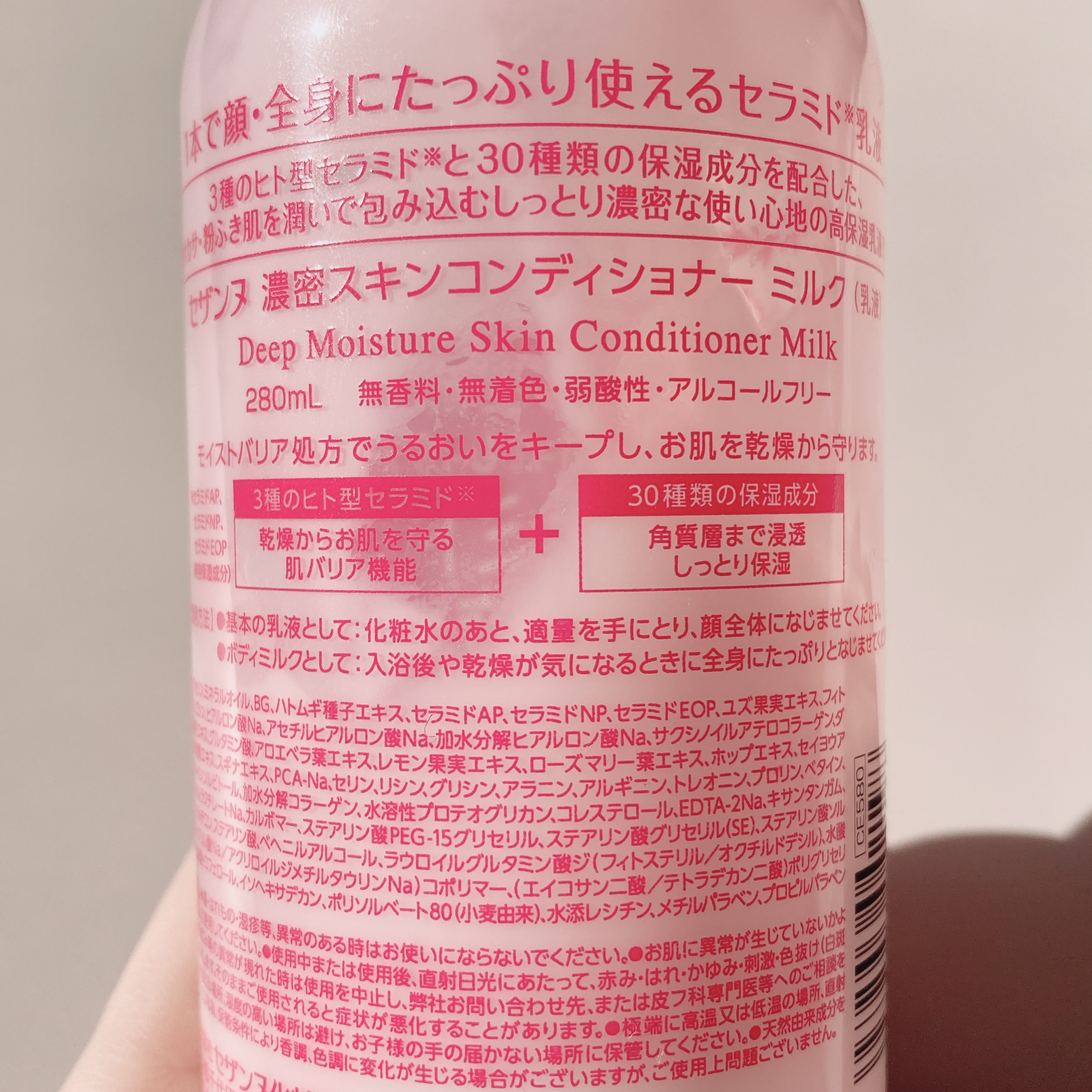- 大容量で大人気の「濃密スキンコンディショナー」シリーズからカサカサ・粉ふき肌を潤いで包み込みしっとり濃密な使い心地の高保湿乳液が新登場♡ 全身にも使える280mlの大容量サイズ! ■セラミドによる肌バリア機能 ヒト型セラミドが乾燥や摩擦などの外部刺激からお肌を守る肌バリアを形成。 肌内部を潤いで満たし、ごわついた肌表面をなめらかに整え、もっちり肌に♪ 3種のヒト型セラミド※とヒアルロン酸Na、ハトムギ種子エキスなど30種類の美容保湿成分配合。 ※セラミドAP、セラミNP、セラミドEOP(美容保湿成分) ■ベタつかない こっくりとしたテクスチャーなのに伸びがよく、すばやく馴染んでベタつかない! 朝のベースメイクもヨレずに仕上がります。全身にもたっぷり使えて、吸い付くような乾燥知らずのお肌に♪ ■毎日たっぷり使える 惜しみなくたっぷり使える280mlの大容量サイズ。朝晩使って3ヶ月分! ■無香料・無着色・弱酸性・アルコールフリー